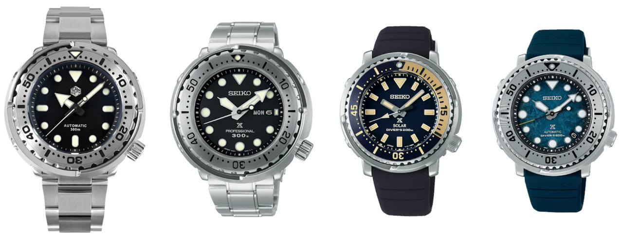 Упомянутые ниже тунцы: San Martin (участвует в этом обзоре), большой Seiko S23633J1 и два Baby Tuna — SRPF81J1 (участвует в этом обзоре) и SRPH77K1. Фото: разные интернет-магазины