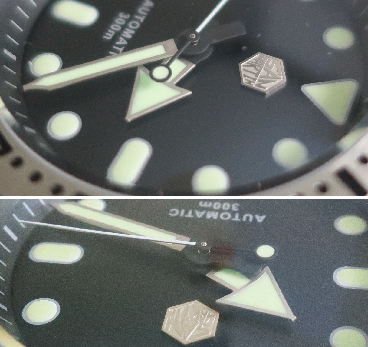 К стрелкам Seiko вопросов тоже нет: отделка — демонстративно грубая, вырубка ровная, а люм намазан образцовыми прямоугольниками.