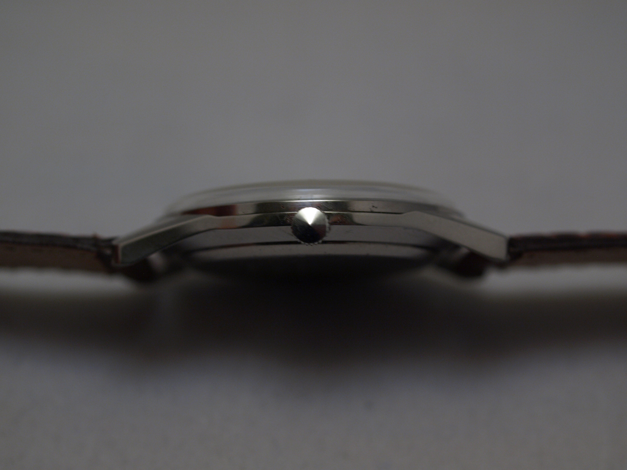 На фото эти редкие часы в практически идеальном состоянии (репассаж в мастерской Чайкина, восстановленный циферблат, идеальное состояние стекла и диска дат, кожаный ремешок, полностью аналогичный по внешнему виду оригиналу 1964-го года, задняя крышка с мелкими царапинами (не полировалась во избежание удаления оригинальной маркировки) и полной надписью, точность хода +- 20 сек/день).