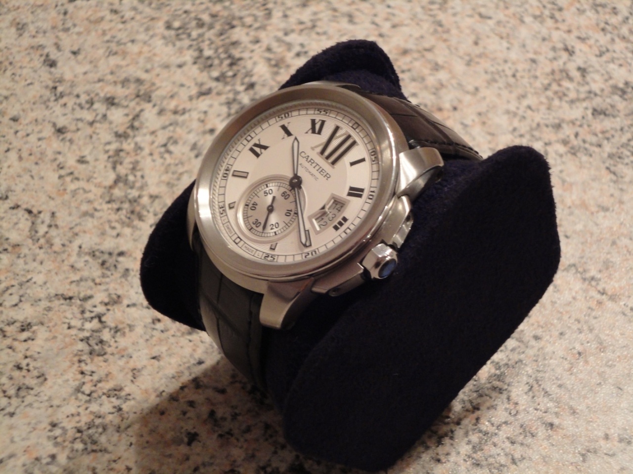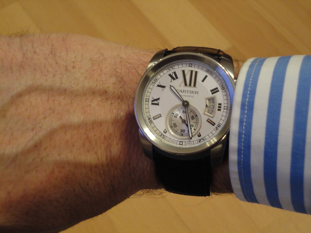 Ну да может быть не совсем привычный для Картье, ибо мы привыкли к Танкам, Сантосам и уже даже к Балон-блю, но насчет Сейко я даже и не знаю - видел Сейко только на фото... Помнится я раньше писал про то как мне не нравится система крепления бакли к ремешку у Картье и как Калибр де картье, в частности, хуже лежит на руке именно в версии с ремешком. Теперь готов это опровергнуть. Разрешили мне в ходе одной из последних примерок еще применительно к моему часовому сету поиграться с этим ремешком, так вот перегнул я его так, как мне было удобно, а не консультанту не жалко - и ничего - на руке лежит хорошо, ничего не мешает, следа от перегиба никакого нет и вообще смотряться даже лучше чем на браслете.