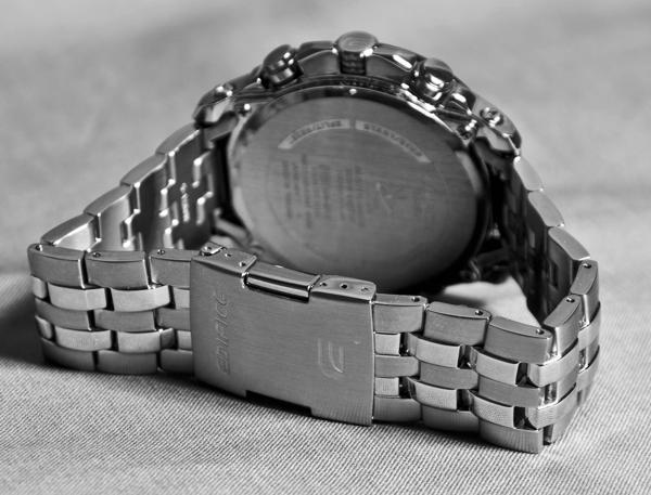 Теперь подробнее о самих часах. В какой-то рекламке интернет- магазина проскочило, что это часы Феттеля, нынешнего чемпиона Формулы-1, но по-моему Феттель рекламирует M1000. Но гоночный дух в модели присутствует. Циферблат реализован в духе приборного щитка автомобиля, отметки на 2,4,8,10 часов выполнены в виде винтов со шлицами, ориентированными по радиусам. Три циферблата секундомера со счетчиком минут, секунд, десятых и сотых по центру основного циферблата. Накладная надпись Edifice, дополнительный 24-часовой указатель местного времени на 6 часов. Секундомер может считать максимум 24 минуты. По моему мнению, без него вообще можно было бы обойтись, потому что совершенно непонятно, как при такой реализации индикации можно вообще определить, какой показан результат. Или может быть это я со своей начинающейся дальнозоркостью выпендриваюсь? Хотя для меня присутствие или отсутствие секундомера большой роли не играет. Секундомер – это спорт, а для спорта у меня есть соответствующие часы- электронные. Цифры можно с Луны увидеть.
