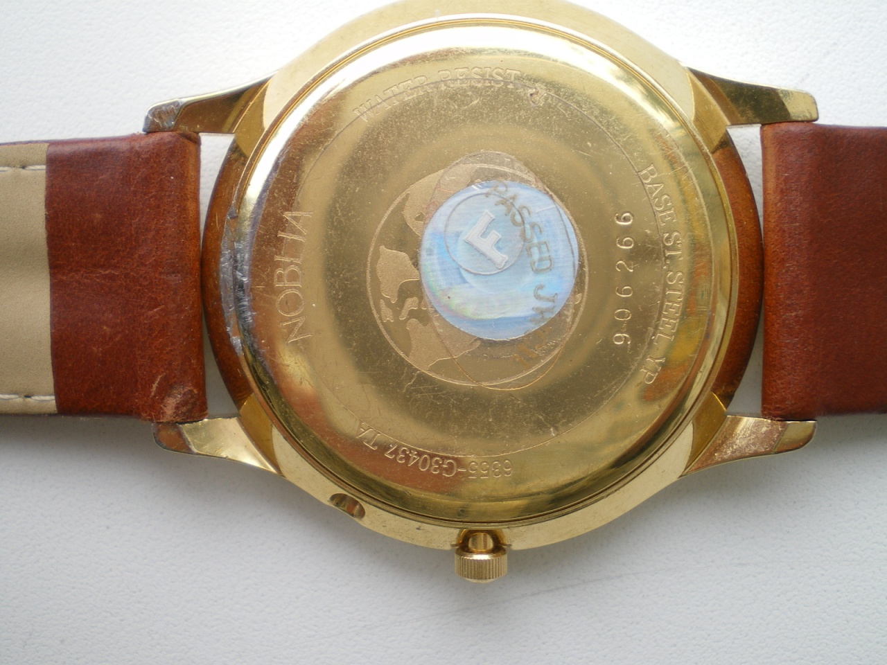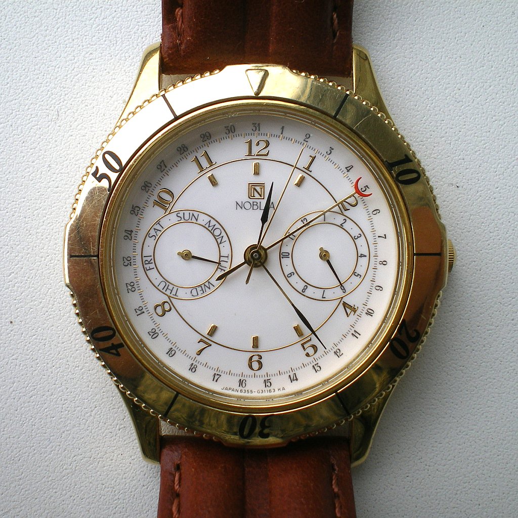 Часы, естественно, не новые. Торговая марка Noblia была зарегистрирована в США с 1985 по 2005 годы, а более или менее активно использовалась примерно до 1998-го. Серийный номер часов состоит из 6 цифр, что означает год выпуска после 1987-го. Поскольку его первая цифра - девятка, это должен быть 1989-й год. Если это правда, то часы очень неплохо сохранились для своего более чем 20-летнего возраста. Самая пострадавшая от времени часть - верхняя поверхность безеля, которую, похоже, часто вращали шершавыми пальцами, в результате чего она довольно густо покрыта царапинами, хотя и мелкими. Стекло в гораздо лучшем состоянии: следы эксплуатации есть, конечно, и на нем, но чтобы их увидеть, приходится сильно щуриться (или надевать лупу часовщика) и долго искать подходящие углы падения/отражения света. Корпус практически свободен от царапин, а на задней крышке до сих пор сохранилась заводская пленка. Точность хода - обычная для кварцевых часов, уходят вперед примерно на 8-10 секунд в месяц. Предыдущий владелец как-то мельком обмолвился о проблемах с переводом даты, которые у него возникали пару раз, но я ничего криминального в этом смысле пока не наблюдал: ежедневно указатель начинает перемещаться примерно в 23:15 и в течение часа ползет до отметки следующей даты. Дни недели и месяц также переходят без проблем.