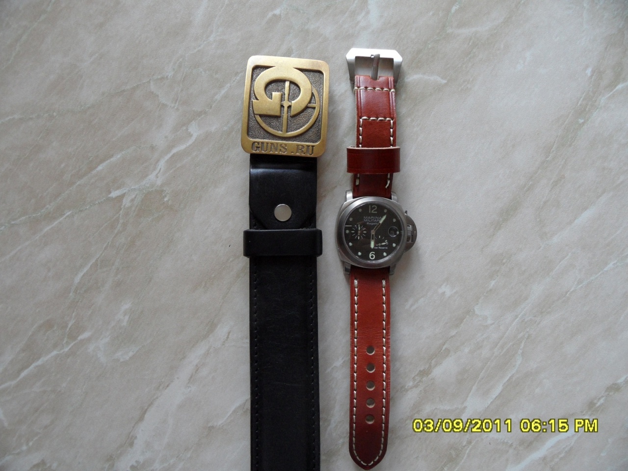 Впечатления от часов получились смешанные. Несмотря на то, что хоммаж в габаритах Гражданской Орки – на руке выглядит значительно массивней и брутальнее. Настолько, что пока я не пересажу часы с кожаного ремня на каучук – не рискую фотографировать их на руке, уж очень они несуразно смотрятся. Для масштаба привёл фотографию с поясным ремнём ширины 40мм - как видно, разница непринципиальна. Основное огорчение доставил как раз кожаный ремень. Попросил включить вместо стандартного варианта Oxblood Handmade Strap with Handed Stitched. И вот эти самые Handed Stitched оказались сделаны плохо. Один из хлястиков разошёлся почти сразу, и к прошивке самого ремня есть вопросы – на фото видно торчащие нитки.