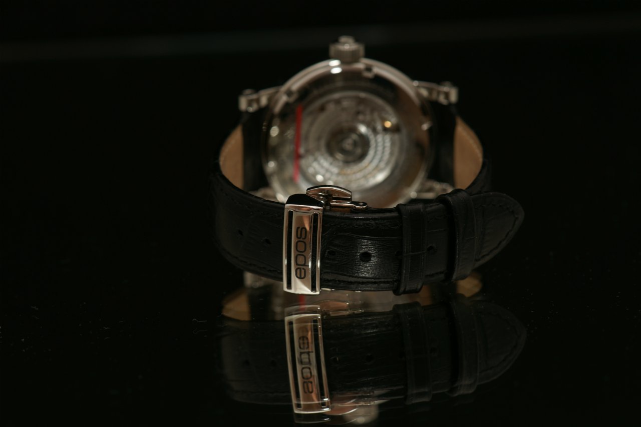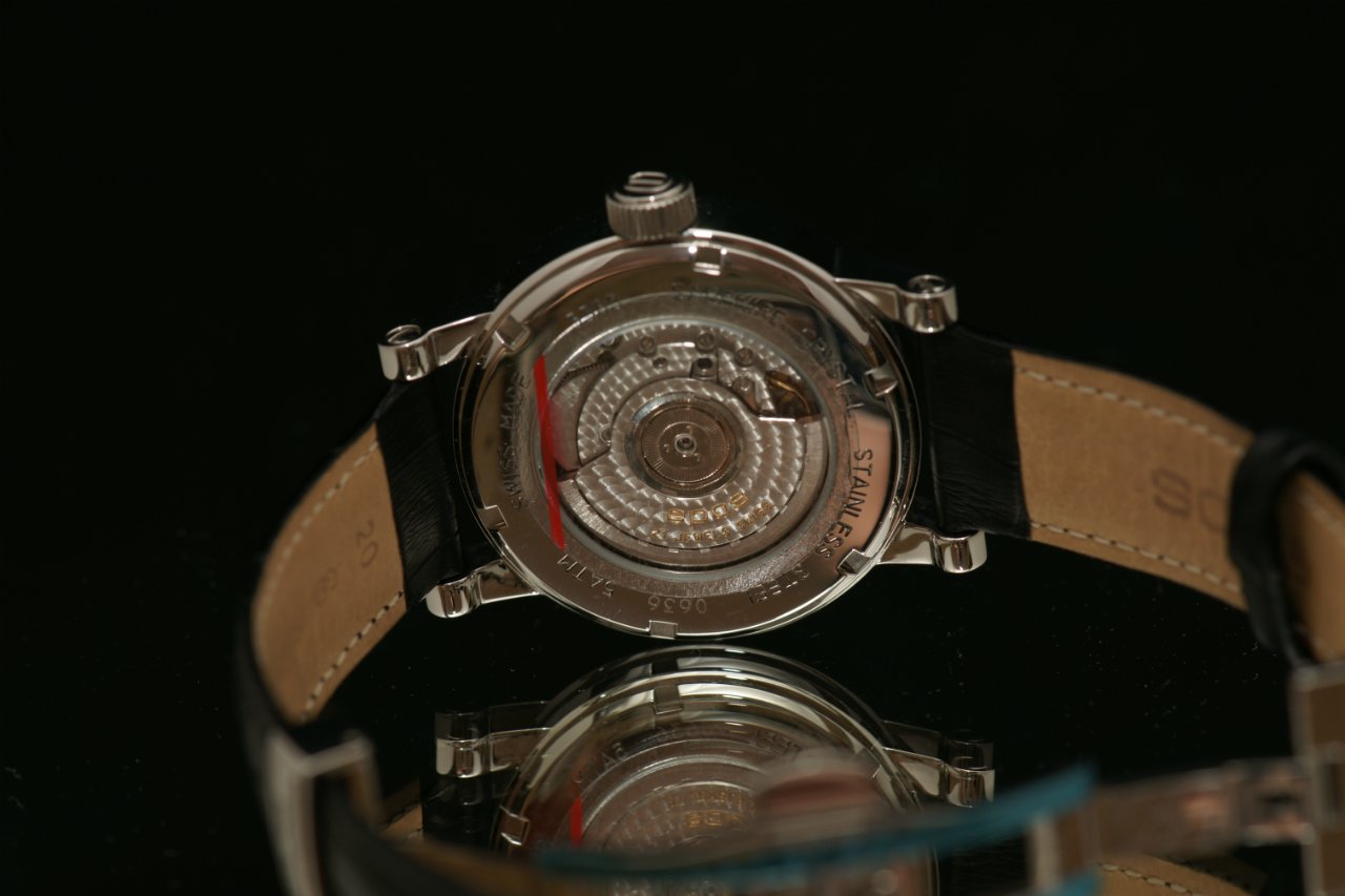 Механизм декорирован "perlage" (жемчужным зернением), индикация даты на 6 часов, прыгающий час в положении 12 часов, минуты и секунды указываются стрелками, закручивающаяся прозрачная задняя крышка, гильошированный черный циферблат.