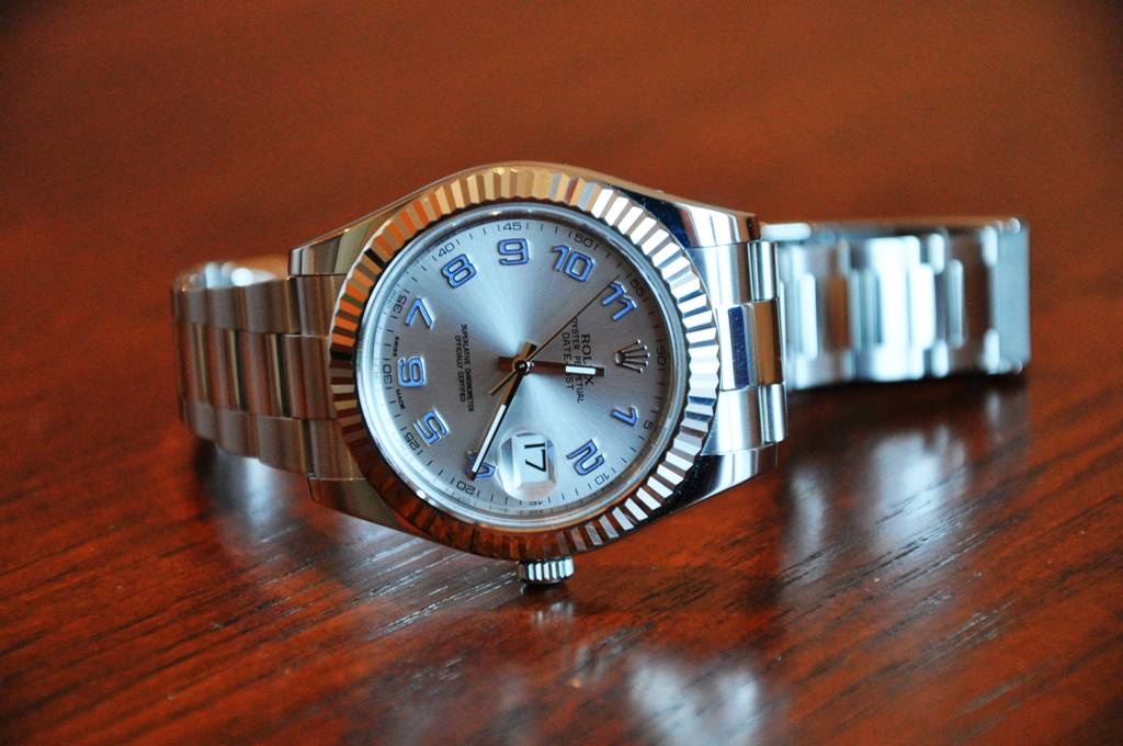 Стальной Rolex Datejust II, ref. 116334, с синими цифрами и родиевым циферблатом.