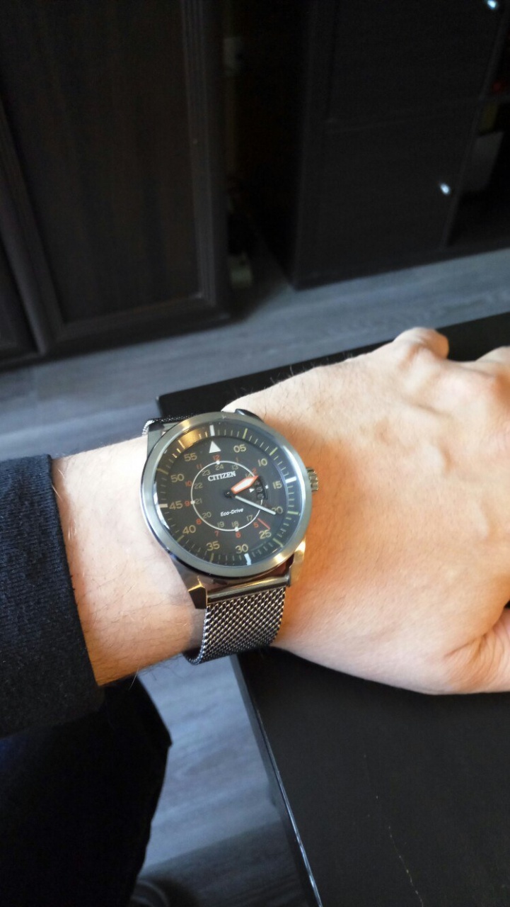 Никогда не было японских часов. Приобрел CITIZEN AW1360-12H. В форм-факторе Пилот. Корпус 45 мм без ЗГ. Неплохая модель, простая, лаконичная, читаемая. Жалко кончено, что производитель сэкономил на люме, нанес его только на стрелки, ну хотя бы треугольник и 4 риски и был бы совсем другой расклад. Родной ремешок был сразу демонтирован, ибо совсем не впечатлил, цвет очень сомнительный, ширина от 22 до 18мм, 18 мм на мою руку, как то не серьезно)). Его место занял миланский браслет, все таки лето на носу. В браслете поразили шпильки с кнопкой для быстрого снятия браслета, под кнопки, на браслете есть выемка, снимать ставить очень удобно. Браслет не родной (с Али).
