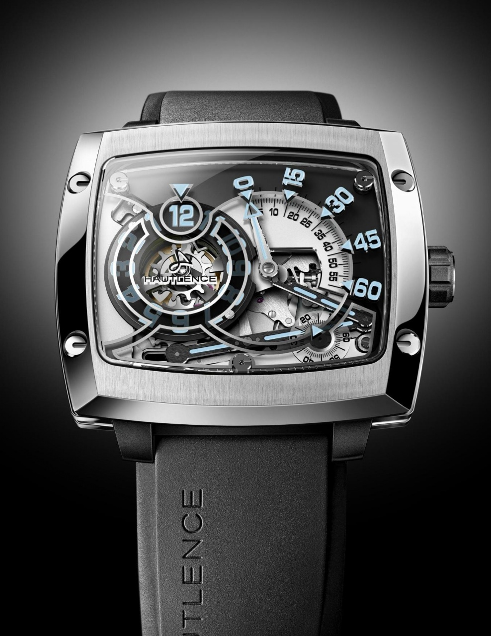 Новая модель Avant-Garde от швейцарской часовой компании Hautlence имеет подушкообразный корпус, изготовленнный из 18-каратного розового золота, титана или нержавеющей стали с черным DLC-покрытием, длиной 46 мм, шириной 42 мм, толщиной 13 мм, водонепроницаемый до 30 метров. Сапфировое стекло установлено на передней стороне корпуса (с антибликовым покрытием) и на его задней крышке. Циферблат сложный многоуровневый, с элементами, отделанными в виде сот, полупрозрачными сапфировыми пластинами.