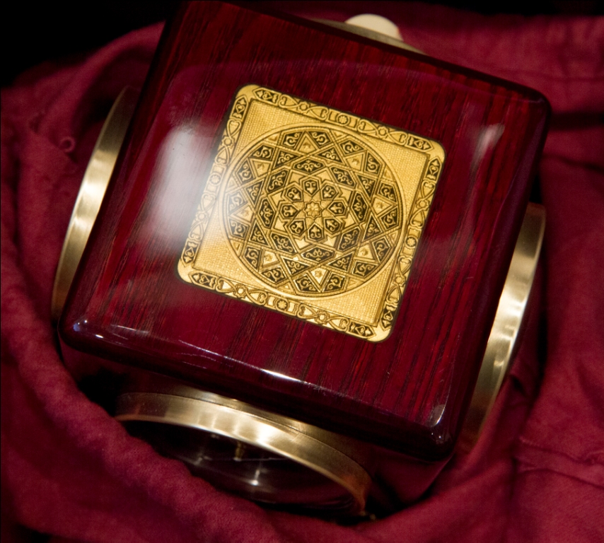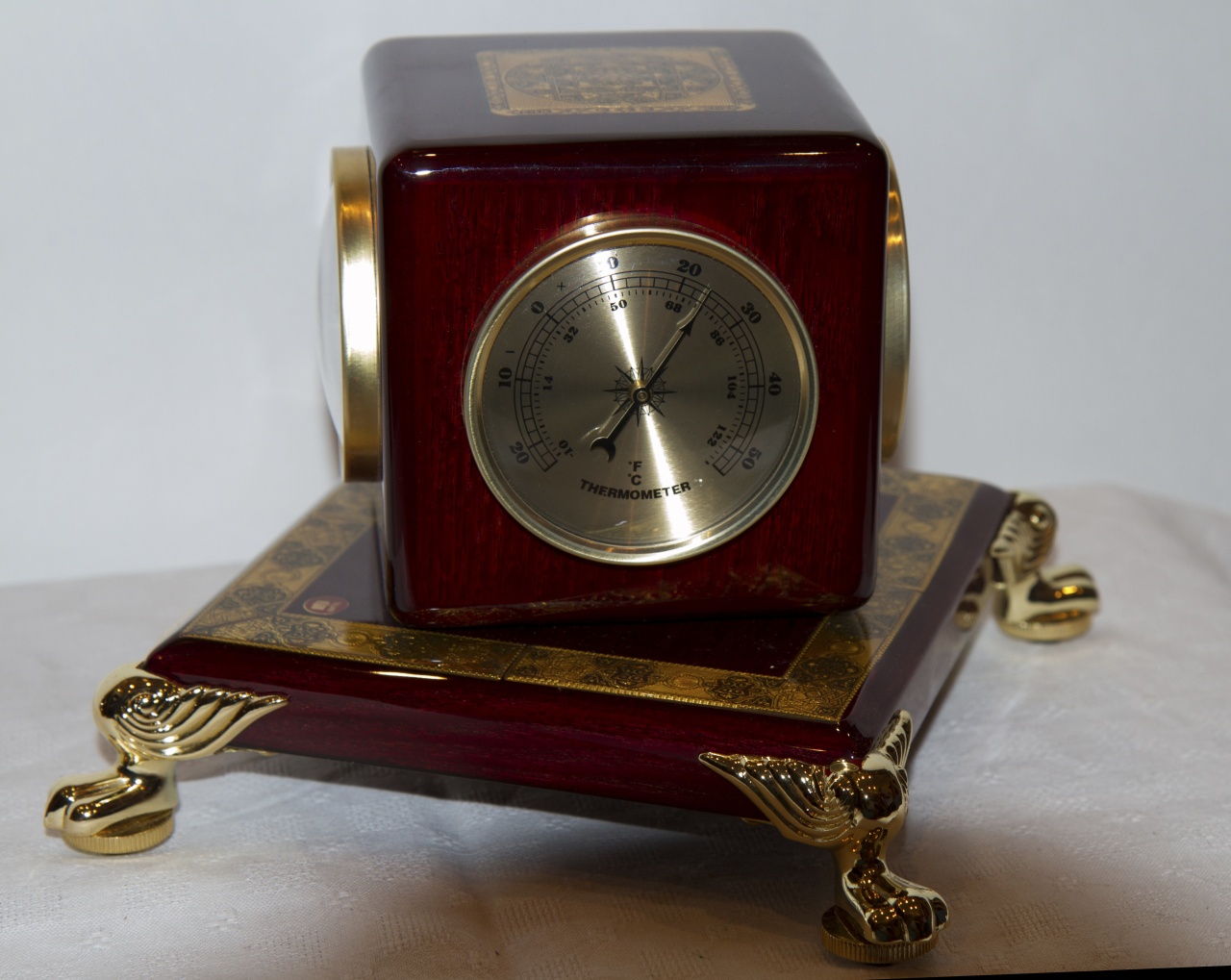 Часы изготовлены из орехового дерева с блестящим 12-ти слойным покрытием, используемым при изготовлении роялей. На каждой стороне кубика, поставлен измерительный прибор: часы, гигрометр для проверки влажности, барометр для проверки давления и термометр для проверки температуры. Некоторые детали корпуса украшены декоративными пластинами, изготовленными по Дамасской технологии с использованием сусального золота 24kt.