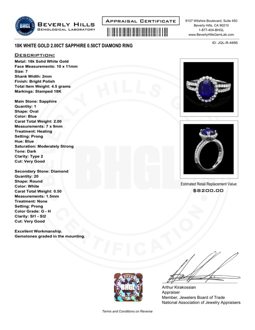 Кольцо прошло сертификацию по международным стандартам, и имеет персональный сертификат, в котором содержатся сведения о количестве, каратности и качестве драгоценных камней и бриллиантов. Дополнительно, в сертификате указана экспертная оценочная так называемая «минимальная розничная стоимость», которая может служить основанием для определения цены или для страхования.