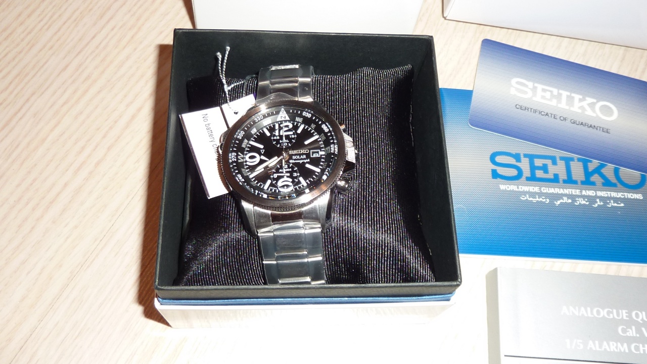 Кварцевый хронограф с функцией 12-ти часового будильника и подзарядкой аккумуляторов от солнечного света. Калибр V172. • Смещенная секундная стрелка в положении 9 часов. • Окошко даты. • 12-ти часовой будильник. • Секундомер с точностью показаний 1/20 сек и максимальным временем измерения - 59 минут 59 сек. Центральная стрелка - секундная стрелка хронографа. Счетчик минут расположен в положении 12 часов. • Режимы ADD - измерение времени с перерывом и SPLIT (сплит-хронограф) - промежуточный финиш. • Точность хода +/-60 сек в месяц. • Срок работы после полной зарядки аккумуляторов - 6 мес. • Индикация низкого заряда аккумуляторов. • Функция предотвращения избыточной перезарядки аккумуляторов. • Точность хода +/-15 сек в месяц. • Стекло: Хардлекс (Hardlex) – специальный минеральный хрусталь повышенной прочности, закалённый в кислоте, разработанный компанией SEIKO, и значительно превосходящее обычное минеральное стекло по прочности. • Светонакопительный состав на стрелках и маркерах часа. • Однонаправленный поворотный безель. • Корпус из высококачественного стального сплава 316L с высокими антикоррозийными свойствами. • Литой браслет из нержавеющей стали. • Водозащита до 10 АТМ.