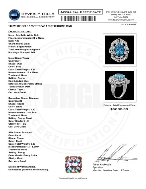 Кольцо Jaqu De Lili белое золото/топаз 5,55 карата/бриллианты 1,03 карата