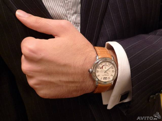 очень красивые часы. механика с автоподзаводом. большая дата, индикатор запаса хода. нержавеющая сталь, циферблат - цвет слоновая кость, цифры большие римские, светомасса на стрелках, прозрачная задняя крышка, заводная головка украшена черным сапфиром, браслетная застежка. Толщина корпуса 11,6 мм, диаметр 39,5 мм. Ремешок из крокодиловой кожи. WR 100м. также в наличии ремешок цвета бургунди, хирш, под цвет индикатора. мелкие потертости на пряжке. отличное состояние, коробка, документы в наличии.