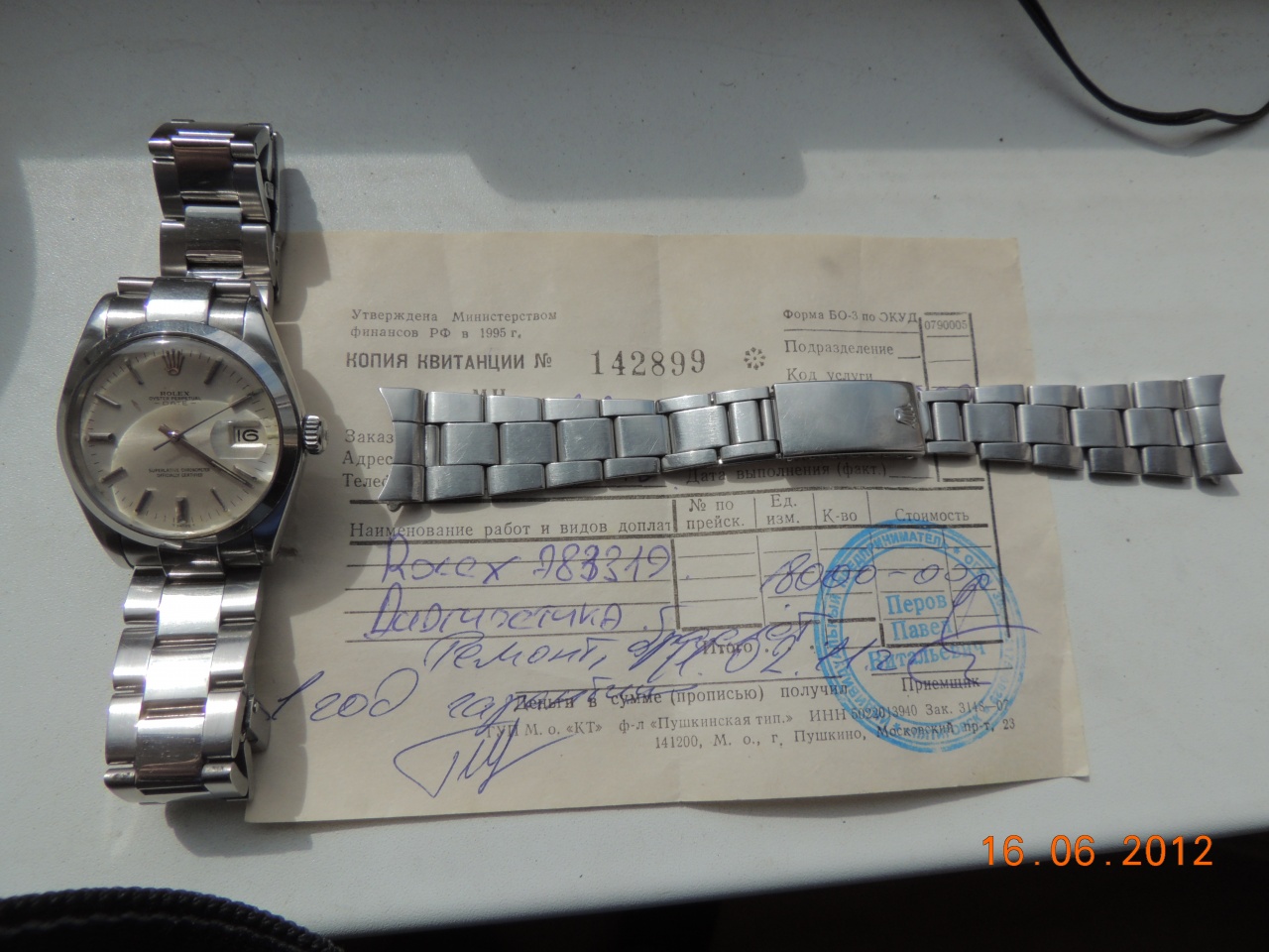 А настоящий facelift/overhaul, то бишь на языке форумчан репассаж, был учинен часикам лишь спустя 30 лет, в прошлом феврале. Посыпая голову пеплом, не был знаком тогда еще со столь уважаемым мною, равно как и всем населением форума, не побоюсь этого слова, великим г-ном Бабаниным, статьями которого зачитываюсь взахлеб, не понимая, как можно так изысканно и c таким вкусом писать о механизмах, которые буквально оживают на страницах сайта при их описании Мастером, и признавая за ним недюжинный эпистолярный талант, и с которым имел удовольствие познакомиться чуточку позже. А тогда, то есть в феврале 2011 два гаврика из не буду говорить откуда (и так видно на фото) содрали с меня 15 тыс за (в их понимании) репассаж, после которого 40-летний Ролик действительно ходит в пределах 1-2 сек в сутки, но дата теперь перескакивает не ровно в полночь, а аж за 40 минут до полуночи. (Не иначе как "Борисова болезнь", а проще говоря, тоже руки не оттуда растут). Да еще 3 тыс за неродной браслет, который просто стал необходим, как воздух, поскольку родной, славно отслужив свое, уж совсем разболтался после 20 с лишним лет непрерывной и весьма активной носки в конце прошлого века и наотрез отказался подтягиваться.