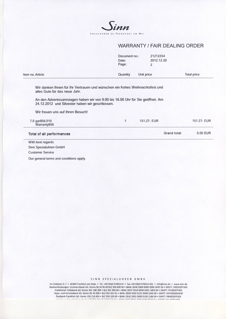 Всем добрый день, и вот снова сказ про мои Sinn 856 UTC (читаем мой пост = Sinn 856 UTC вытеснивший Milgauss!). Итак, с подозрениями на намагниченность (из-за не точности хода) ПОКОНЧЕНО . Я послал свой годовалый экземпляр на завод Sinn для гарантийного обслуживания. Отвечают очень оперативно и очень вежливо. Использовал самую обычную (канадскую) почту за 17 баксов. Через 1,5 недели получил подтверждение - часы прибыли, осматриваем. Сегодня, еще через 7 дней, получил диагноз - все ОК. Смотрите ниже квитанцию, что прислали по e-mail. Как видно - почистили, снова заправили газом (как зажигалку), отрегулировали и шлют мне обратно. Таким образом, никакого геморроя с ТО нет, да и стоимость ТО (по гарантии, как видно в квитанции - бесплатно) весьма адекватная (150 евро). Что дальше?! НО, друзья мои - поиск идеальных, единственных часов продолжается, и я перехожу от Зинн в стан Muhle.