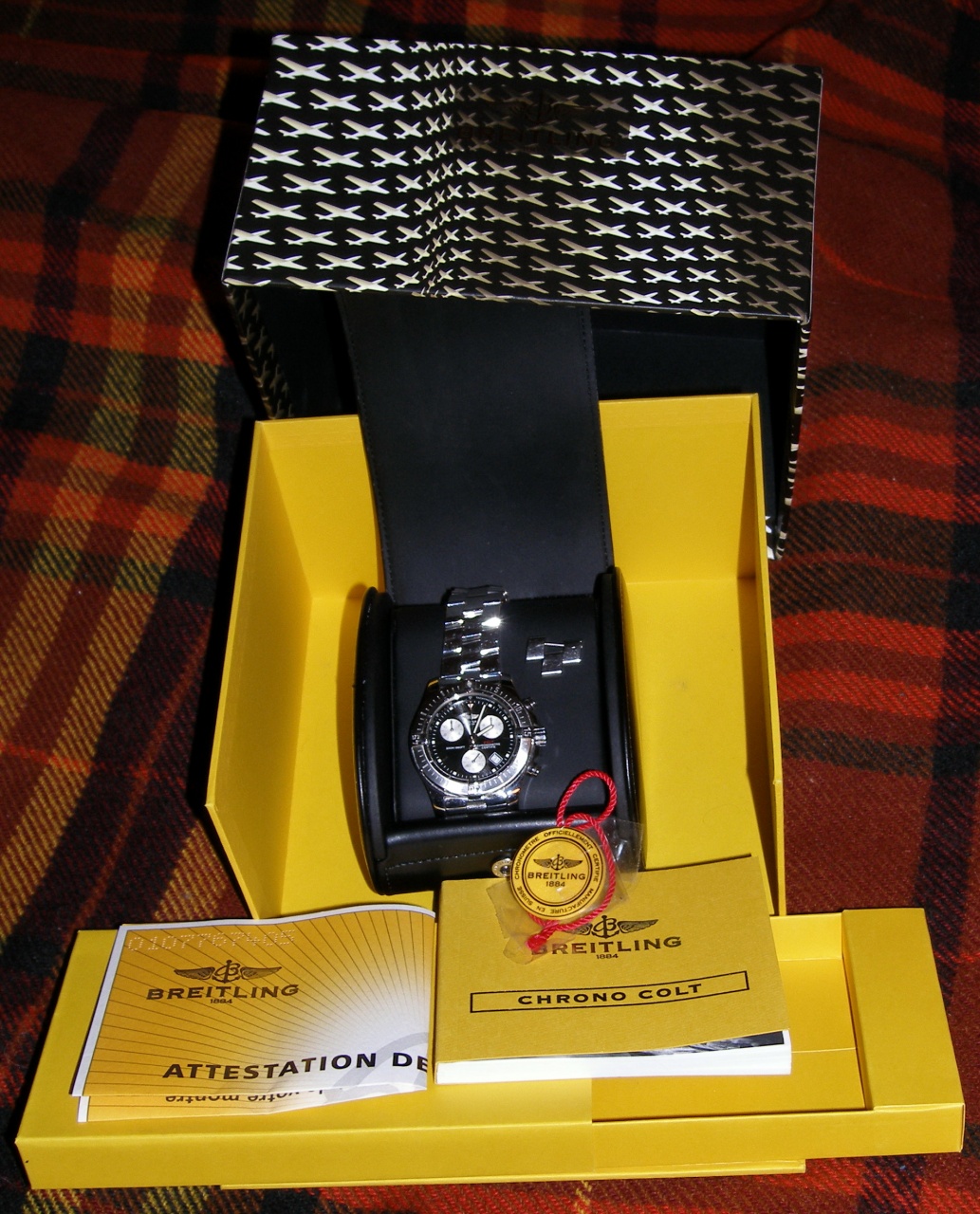 Breitling Aeromarine Colt II Chronograph Super quartz референс А7338011-B782-811A. Калибр Breitling 73 суперкварц с термокомпенсацией. Есть функция сплит хронографа. Стекло сапфировое с двойным антибликом. Размер часов в диаметре 41,5 мм без заводной головки. Браслет был уменьшен на три звена, одно нашел, еще два поищу, где то лежат в мешочке. В комплекте 2 коробки, документы- сертификат хронометра COSC. Любые проверки на подлинность и точность хода. Строго Москва- пересыла нет.