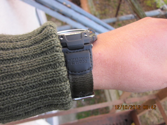 Теперь ближе к телу. Сабж был куплен новым, на украинской площадке stando, вместе с пересылом обощёлся в 620 гривен (76$). Как говорится -почуствуйте разницу.Описывать часы не имеет смысла, поскольку на ветке есть уже 4 аналогичные темы, все вопросы розкрыты. Однако, поскольку обсуждались и показывались часы на резине (SGV-100-1VEF) - позволю себе остановится на ремешке и отличиях. Итак- ремешок : плотная кордура цвета хаки, с чёрными дермантиновыми вставками. Надписи про водозащиту и наличие компаса/термометра- вытеснены и в отличие от резины мало видны и не подвержены стиранию. Это-плюс. Ремешок достаточно мягкий, внутренняя сторона комфортна к коже (на AMW-700 - он жостче и какой-то колючий). В отличие от резинового - пряжка стальная, в профиле круглая и напоминает пряжку от НАТО-вского ремешка. Кстати, вместо кожаной дермантиновой петли для свободного конца есть идея приколхозить нержавеющую скобу, будет в тему. Отличия в корпусе часов - минимальны: цвет корпуса- хаки вместо серого ( посмотрим, как будет стираться краска) подписи к кнопкам - оранжевого цвета, сектор N-E на базеле -красный. В общем часы получились очень милитари. Эх, мнеб их лет пять назад, когда я из камуфляжа не вылазил! Зато- к ним очень подходит мой любимый свитер!