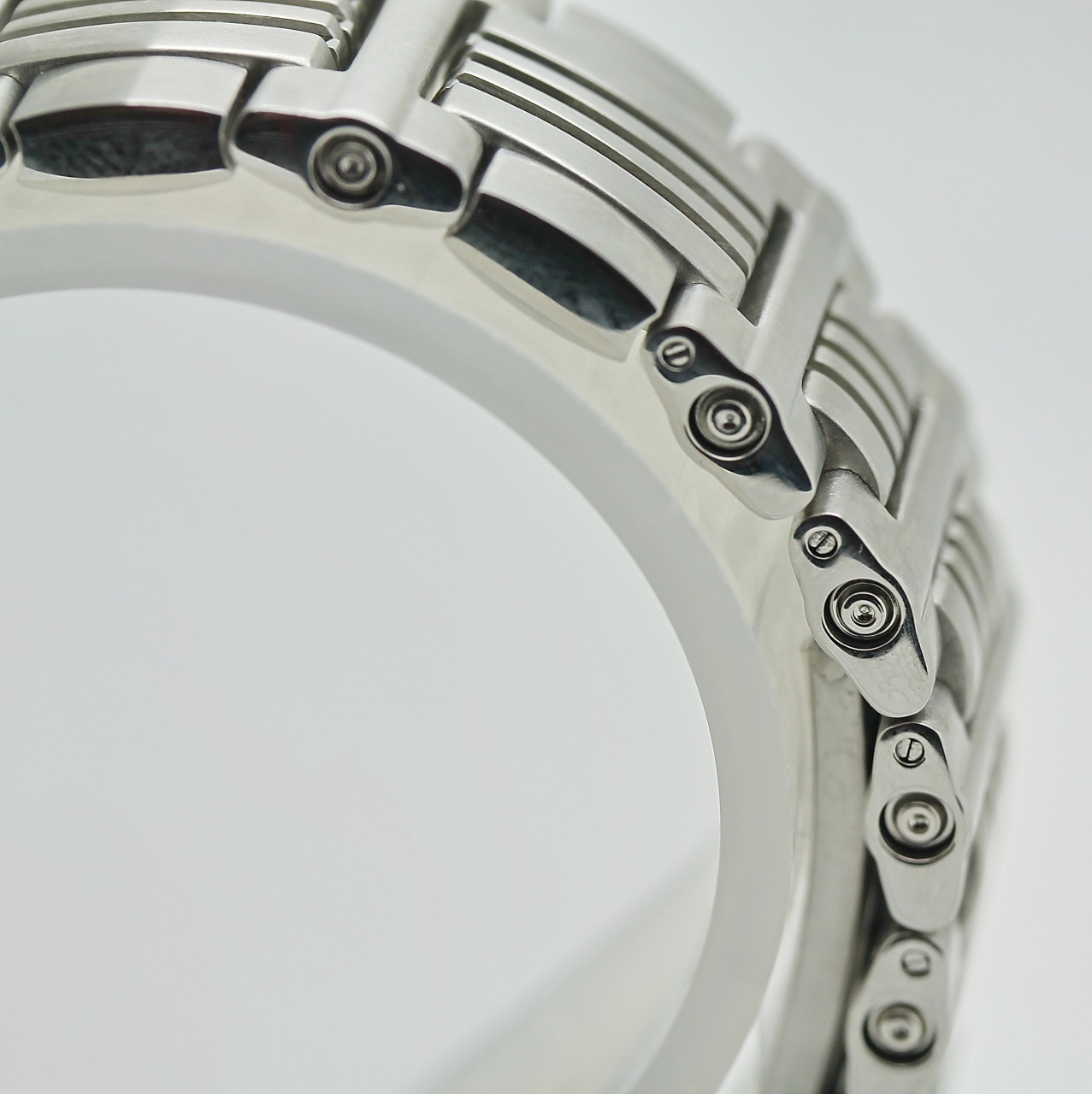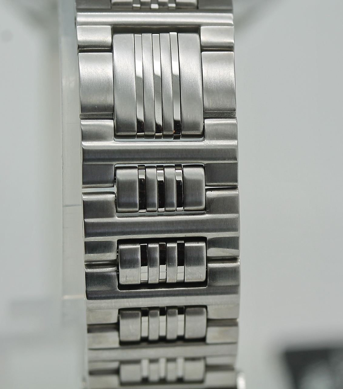 Браслет: Цельный из нержавеющей стали,заслуживает всяческих похвал,по 4 звена с обеих сторон от браслетного замка меньше по размеру,за счёт чего можно достичь боее точной регулировки по зпапястью.