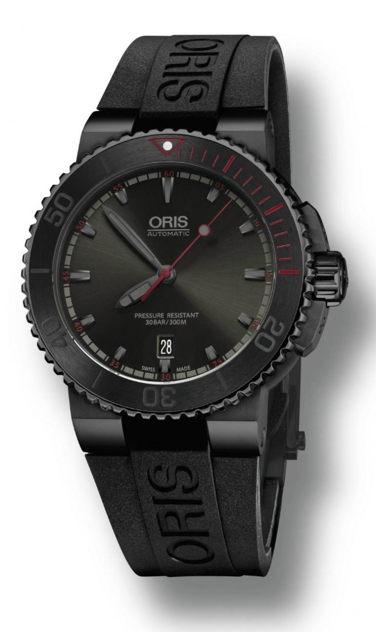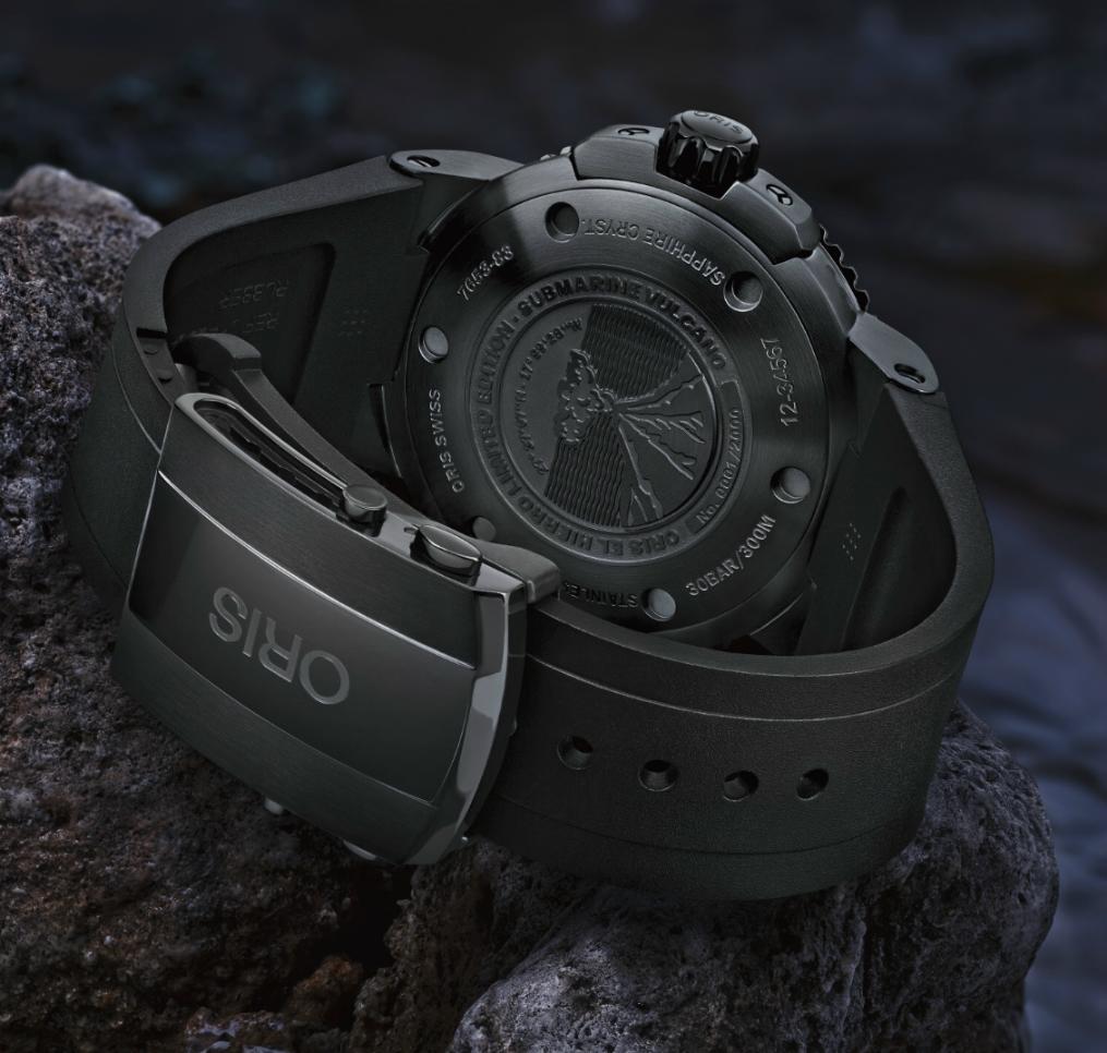 Новинка имеет многокомпонентный круглый корпус, изготовленный из нержавеющей стали с черным DLC-покрытием, диаметром 43,0 мм, водонепроницаемый до 300 метров. На торце защищенной завинчивающейся рифленой заводной головки, расположенной на 3 часах, выгравировано наименование бренда Oris. Вращающийся однонаправленный дайверский безель с полированной керамической черной вставкой. Завинчивающаяся задняя крышка часового корпуса глухая, с гравированным изображением подводного вулкана El Hierro и его координатами. Выпуклое сапфировое стекло с антибликовым покрытием защищает черный циферблат с лучистой отделкой, с накладными часовыми индексами и стрелками, покрытыми люминесцентным составом SuperLumiNova серого цвета. Модель оснащена швейцарским автоматическим механизмом Oris 733 (базовый калибр Sellita SW200-1), на 26 камнях, с балансовой частотой 28800 полуколебаний в час (4 гц), 38-часовым запасом хода, функциями индикации часов, минут, секунд (посредством соответствующих центральных стрелок), и даты (посредством соответствующего цифрового указателя в прямоугольной апертуре, расположенной на 6 часах).
