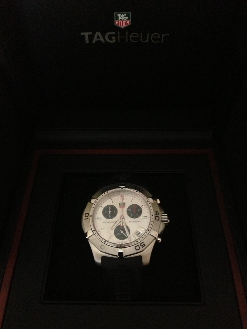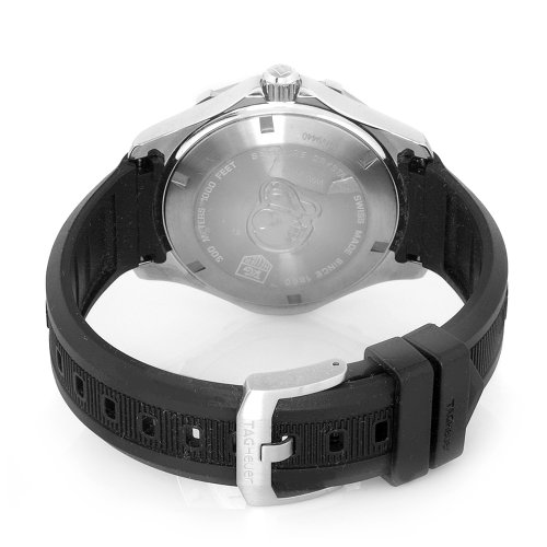 Кварцевый механизм ETA 251.262 Спортивный дизайн циферблата, светящиеся часовые метки. Указатель даты в положении "4часа". Цветной знак TAG Heuer. Надпись « –AQUARACER - 300 meters » Стрелки с полированными гранями и светящимся покрытием для оптимальной читаемости и свечения. Красная минутная стрелка хронографа со стрелкой на конце для лучшей читаемости. Функция простого и суммарного измерения времени, счетчик 1/10 секунды в положении "2 часа", центральная секундная стрелка хронографа, центральная красная минутная стрелка хронографа, счетчик часов хронографа в положении "10 часов" Браслет из матовой стали для моделей с черным циферблатом или с чередованием звеньев для моделей с серебряным или синим циферблатом. Браслетная застежка из прочной стали с двойной блокировкой. Система увеличения длины, позволяющая носить часы на комбинезоне для подводного плавания. Также выпускается с черным каучуковым браслетом с традиционной застежкой. Корпус диаметром 41 мм вырезан из цельной стали Устойчивое к царапинам сапфировое стекло Вращающийся в одну сторону безель, арабские цифры и минутные деления. Светящаяся точка в положении "12 часов". Чередование полированной и матовой стали. Завинчивающиеся заводная коронка и задняя крышка обеспечивают герметичность 300 метров. Задняя крышка с выгравированным подводником.