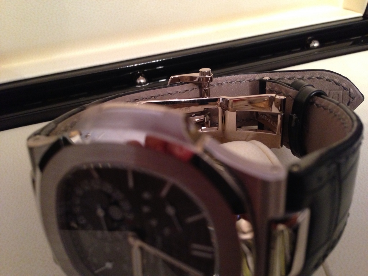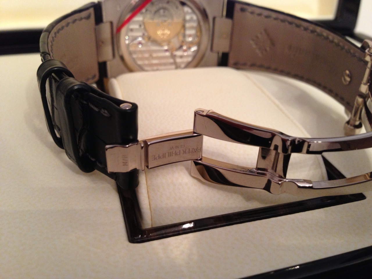 Черный крокодиловый ремень с фирменной застежкой из белого золота.