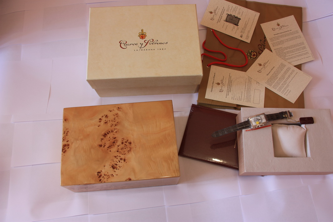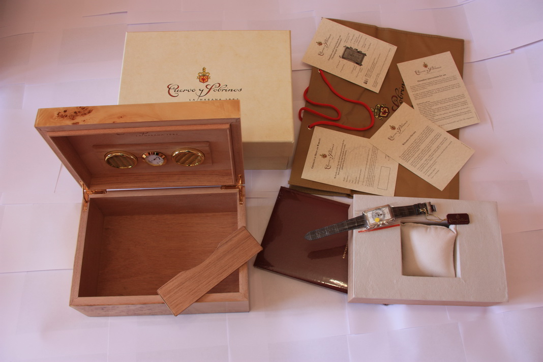 шкатулка в виде хьмидора, инструкция, гарантийный талон, бирка, тканевая сумка с логотипом Cuervo Y Sobrinos.