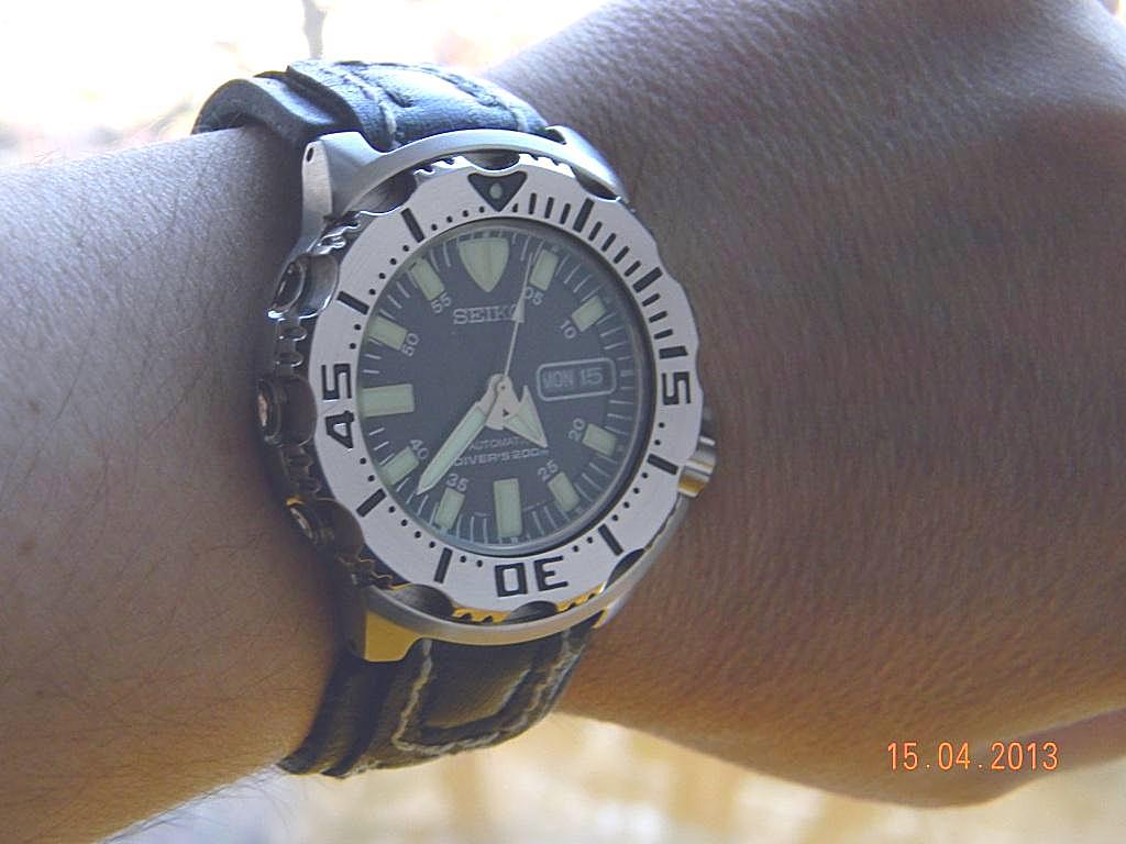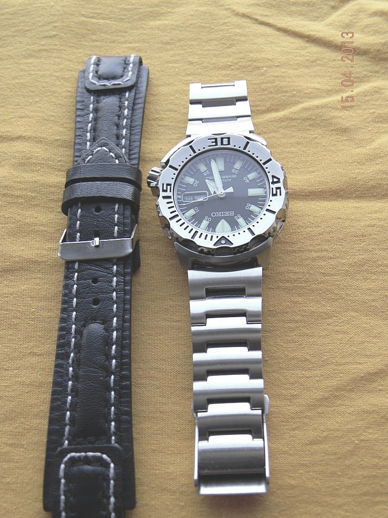 Приветствую всех ув. форумчане! Приобрел недавно легендарные Seiko Black Monster на браслете. Но, так как я имею такую слабость, обязательно доукомплектовывать новые часы, парой-тройкой ремешков, правда где это бывает уместно, то монстра эта участь не обошла. Я конечно ознакомился с соответствующими ветками по монстрам и увидел, что в большинстве своем их или оставляют на родном браслете или рекомендуют, как самый подходящий к ним, ремешок Di Modell Chronissimo. Однако многих, как и меня отпугивает цена ремешка, приблизительно равная половине стоимости новых часов, и это если учесть , что он изготовлен просто из телячьей кожи с пропиткой. Конечно, можно было бы, заказать изготовление такого же ремешка, у известных всем на форуме страподелов. Но, думаю, что я сэкономил бы не на много. И вот, тогда я крепко задумался и просмотрел внимательно картинки с данным ремешком пришел к выводу, что мне самому по силам изготовить такой же, так сказать hand made. Сразу оговорюсь, это не первый изготовленный мной ремешок. Иногда, не скрою, люблю по-страподельнячать на досуге. Но это все для себя, в качестве хобби. Так вот, через пару дней, моих напряженных усилий на гора был выдан вот такой фрак для монстра. Хочу сказать честно, что оригинала я в руках не держал и не щупал. В процессе изготовления использовалось три вида кожи. Для пропитки нижней подложки использовал пчелиный воск. Ни каких логотипов не наносил, дабы не нарушать ничьих прав. Прошу сильно не ругать, но конструктивную критику принимаю. А вот и мой небольшой фото обзор.