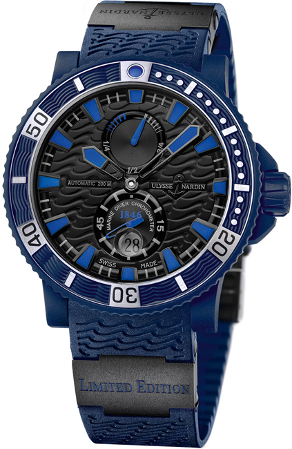 Продажа наручных часов Ulysse Nardin Maxi Marine Diver Blue Sea Limited Edition 999 ref. 263-97LE-3C Baselworld 2012 распахнул свои двери. Одной из первых новинок, представленных на выставке, стали часы для дайвинга Blue Sea от Ulysse Nardin. Швейцарская мануфактура Ulysse Nardin известна своими морскими моделями часов. Blue Sea отличаются своим синим цветом. Корпус был покрыт синим каучуком. Неподвижные части механизма покрыты сплавом на основе нержавеющего синего титана. Часовые маркеры, а также стрелки покрыты голубым люминесцентным материалом для улучшения читаемости. В районе 12 часов находится индикатор запаса хода. В районе 6 часов находится регистр с маленькой секундной стрелкой и увеличенная апертура даты. Часы оснащены завинчивающейся коронкой и вращающимся безелем. Водонепоницаемость корпуса 200 метров. Рисунок волн на циферблате и ремешке характерен для спортивных часов марки Ulysse Nardin. Blue Sea выпускается ограниченной серией 999 штук. Корпус из нержавеющей стали с каучуковым покрытием имеет размер 45,8 мм. Внутри корпуса автоматический механизм. Часы поставляются на каучуковом ремешке с керамической застежкой и вставками.