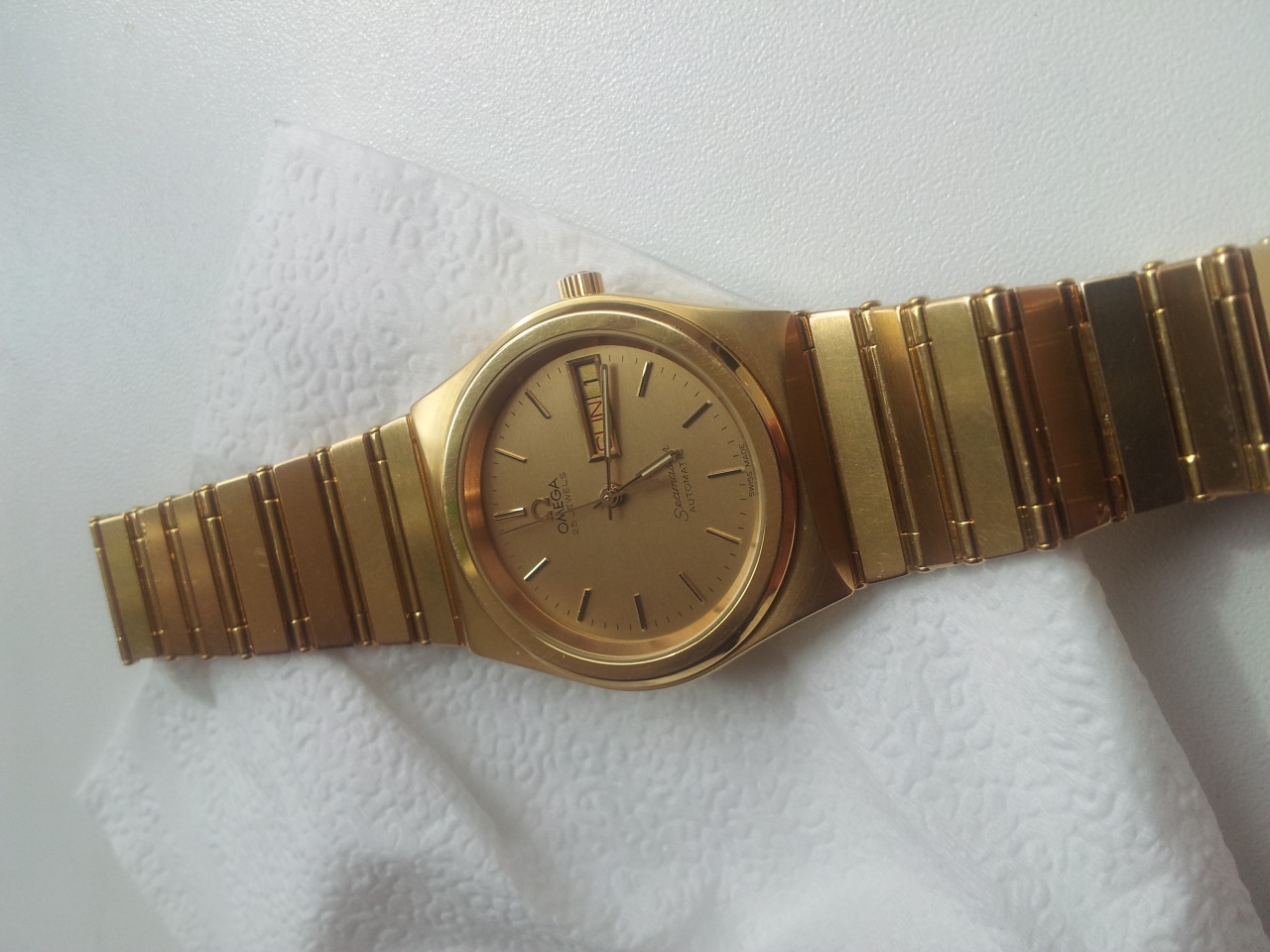 год выпуска ориентировочно 1975-78. Часы в превосходной сохранности для своего возраста, привезены из Японии, покупались летом прошлого года здесь на форуме. Имеют двойной механизм отображения дня недели иероглиф и английский. Часы и браслет выполнены по уникальной технологии раскатки золотого листа поверх стали и таким образом получились часы имеющие сверху тонкий лист НАСТОЯЩЕГО ЗОЛОТА и вес стальных часов. Так как сверху нанесен именно лист золота, а не покрытие или напыление корпус и браслет можно полировать обычным способом. Ничего не сотрется. Однако необходимости в полировке нет, достаточно протереть тряпочкой для чистки золотых изделий и часы сияют на руке как только, что вышедшие из мануфактуры.