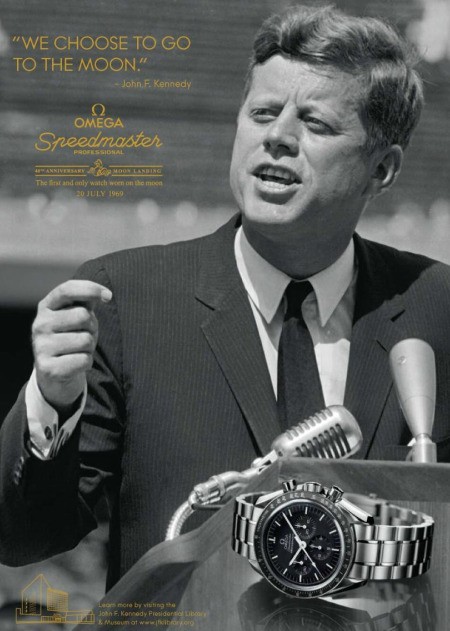 Идея кампании заключается в том, что, поскольку Omega Speedmaster Professional являлись официальными часами, используемыми американскими астронавтами, и, в конечном итоге, попали на Луну, они имеют связь с Джоном Ф. Кеннеди, который сыграл важную роль в содействии усилиям США в полете на Луну и в финансировании этого космического проекта. Хотя, он был убит в 1963 году, за несколько лет до того, как эта космическая программа достигла своей цели.