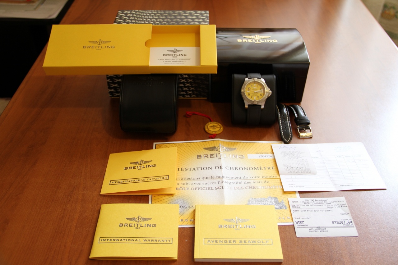 Продаю часы Breitling Avenger Seawolf мужские REF.A1733010/1513/435X Serial N 1204526. Куплены в Тайм Авеню 09.03.2012 г. за 134 300р. Чек прилагается на фото. Дополнительно был приобретен каучуковый браслет на клипсе у официалов за 18287.64 р. Также чек на фото. Итого мои затраты с 15% магазинной скидкой на часы составили 152 587,64 р. Часы на гарантии!!! Полный комплект документов!!! Без оригинального кожанного ремешка цена соответственно ниже.