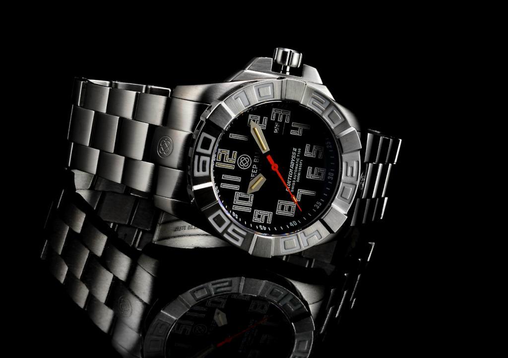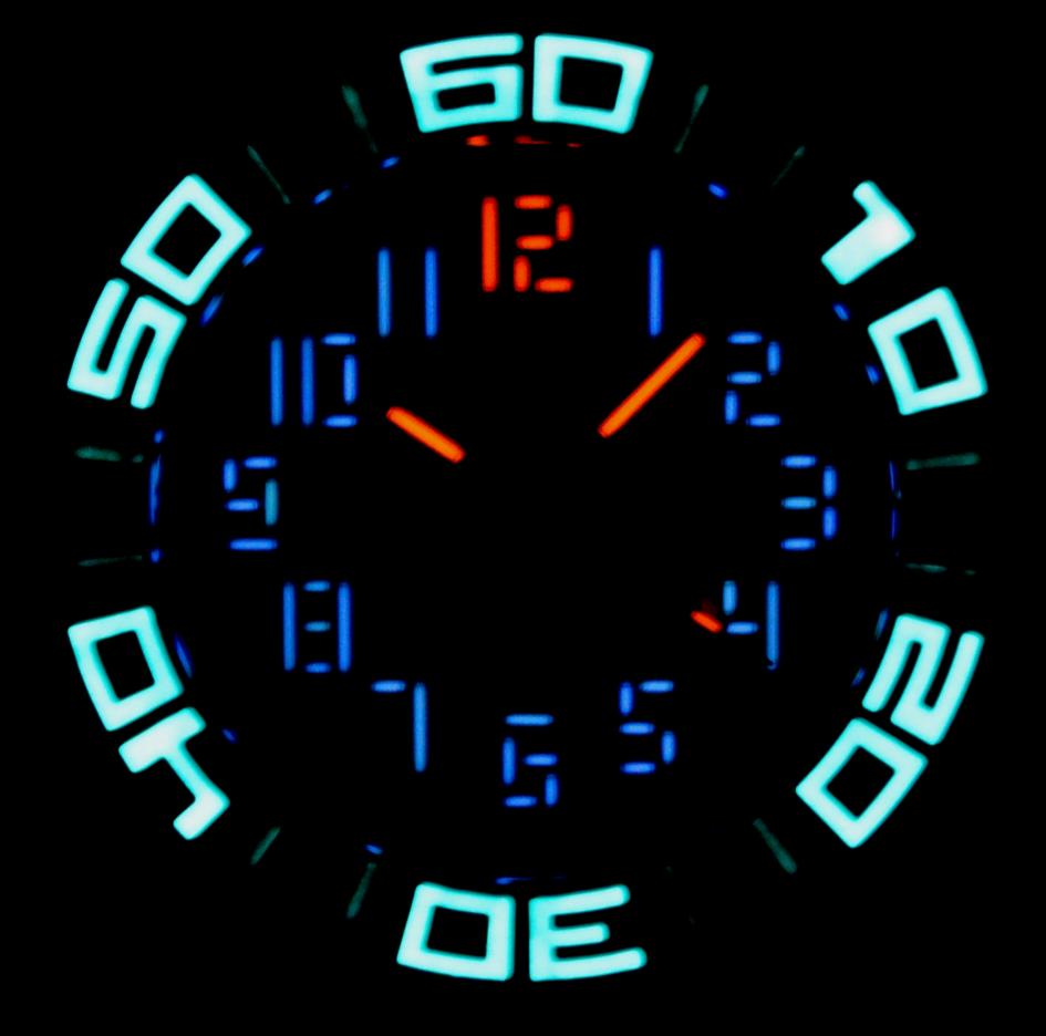 Круглый корпус из нержавеющей стали, диаметром 46 мм, толщиной 18 мм, с расстоянием между дужками 26 мм, водонепроницаемый до 500 метров. На торце защищенной заводной головки, расположенной на 3 часах, выгравирована эмблема бренда. Вращающийся однонаправленный дайверский безель с арабскими цифрами, покрытыми люминесцентным составом SuperLumiNova, светящимся в темноте бирюзовым цветом. Сапфировое стекло установлено на передней стороне корпуса (с антибликовым покрытием) и на его завинчивающейся задней крышке. Циферблат черного, синего, оранжевого или желтого цвета. Роль часовых индексов выполняют 49 микротрубочек, которыми выложены арабские цифры. Они наполнены газообразным тритием, обеспечивающим постоянное свечение, независимо от условий освещенности или отсутствия оного. Причем, 43 из них светятся синим цветом, а 6, из которых составлено число "12" - оранжевым. Кроме того, по одной такой микротрубочке (оранжевого цвета) располагается на часовой, минутной и секундной стрелках.