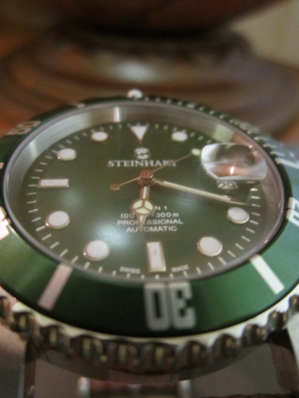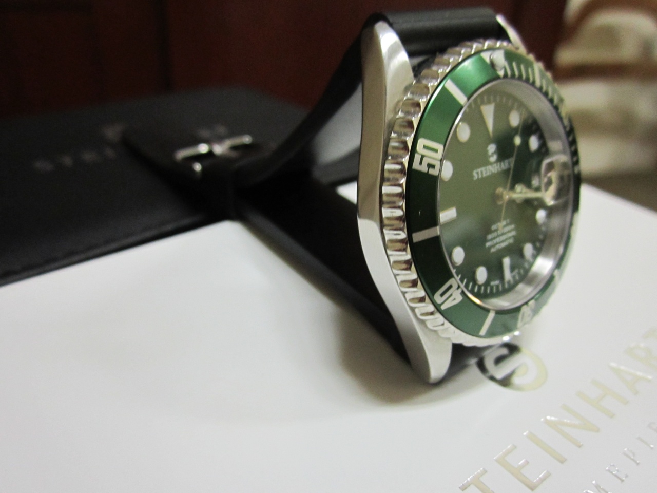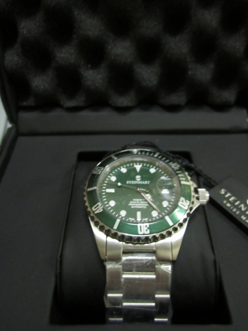 Данная модель Steinhart Ocean One Green Dial, собрана в Швейцарии, покупалась в Германии в 2008 году, часы имеют сапфировое стекло, корпус - 316L сталь, размер - 42 мм без ЗГ, однонаправленный безель, толщина 13 мм, глухая задняя крышка, водозащита 300 M, циферблат и безель зеленого цвета.