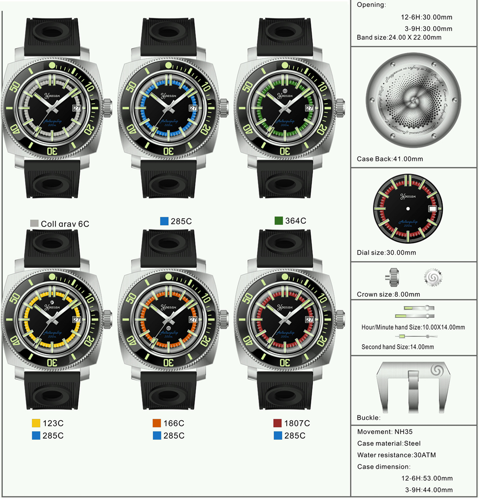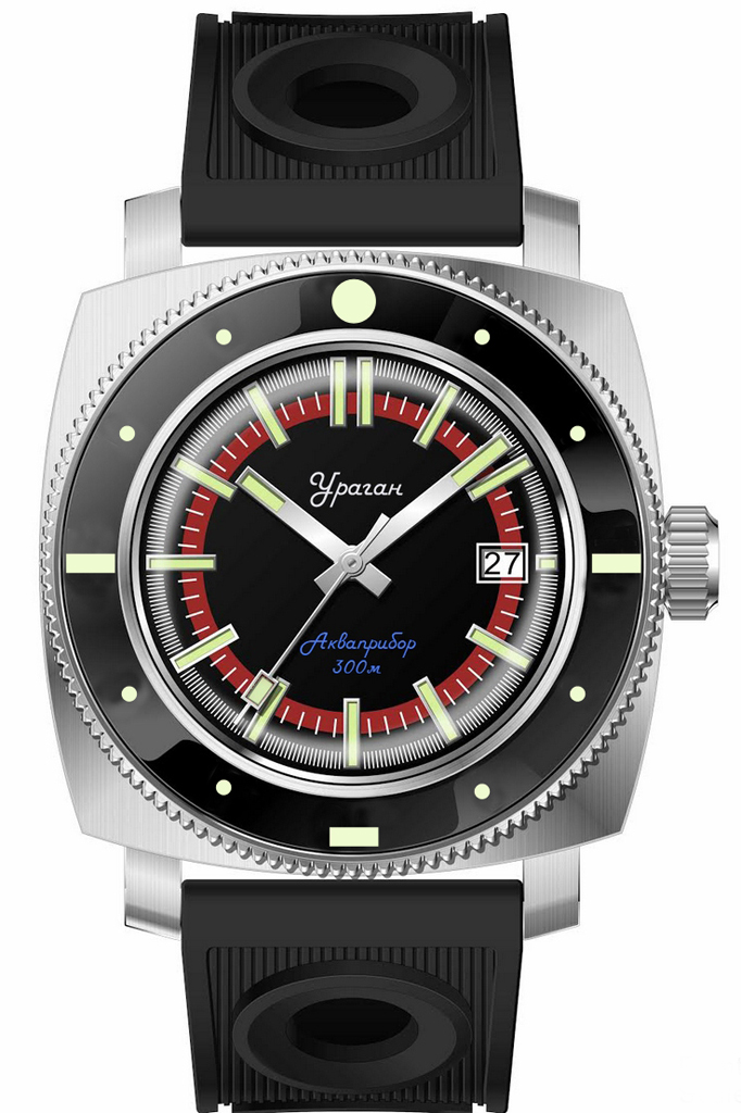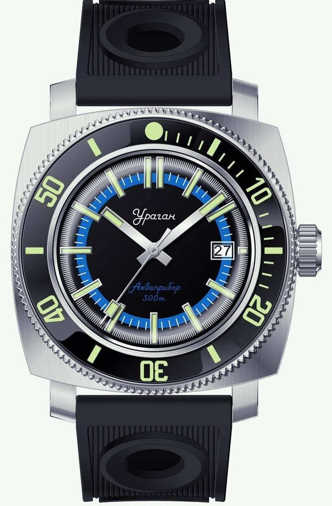 Циферблат: чёрный с цветным радиусным акцентом, часовые метки люминесцентные
