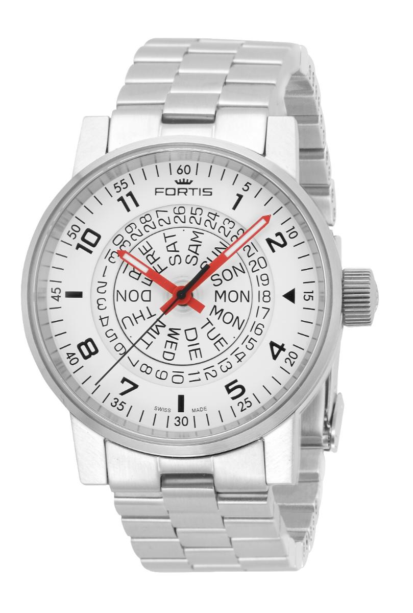 Новая модель Spacematic Bilingual от швейцарской часовой компании Fortis имеет круглый корпус изготовленный из нержавеющей стали, диаметром 40 мм, водонепроницаемый до 100 метров. На торце рифленой заводной головки, расположенной на 3 часах, выгравирован логотип бренда Fortis. Сапфировое стекло защищает циферблат белого или черного цвета с, соответствено, черными или белыми арабскими цифрами. Часовая и минутная стрелки красного цвета, покрытые люминесцентным составом белого цвета. Центральная часть циферблата заполнена вращающимися кольцами с разметкой дат и дней недели (расположенных от периферии к центру). Разметка дней недели выполнена на двух языках - английском и немецком (отсюда и слово в названии модели: Bilingual).