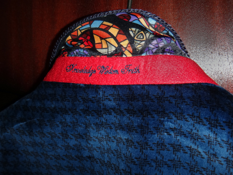 Отворот воротника - контрастная красная подложка и вышитый девиз Robert Graham "Knowledge. Wisdom. Truth." ("Знание. Мудрость. Истина")
