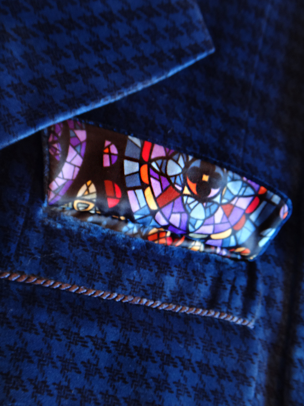 Подкладку кармана можно вывернуть, и получится выглядывающий из кармана яркий платок, сочетающийся по цвету и узору с подкладкой. Это называется "built-in pocket square":