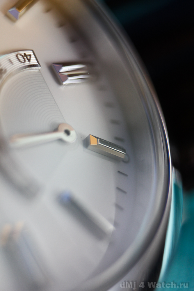 Метки на циферблате также отполированы до зеркального блеска, поверх нанесена черная краска, думаю сделано это для большей контрастности с белым цифером