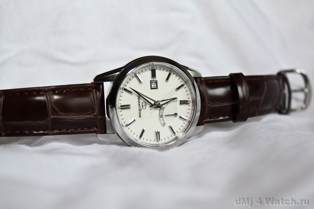 Orient Star WZ0081EL, трехстрелочник на браслете с белым цифером и индикатором запаса хода.