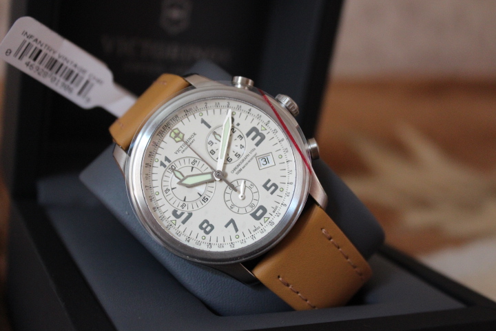 Продаю новую модель от Victorinox Swiss Army - Infantry Vintage Chronograph 241579. Бежевый циферблат и светло-коричневый ремень. Швейцарский кварцевый хронограф с телеметрической шкалой. Стекло - сапфировое с тройным антибликовым покрытием. Механизм ETA 251.272 на 22 камнях. Люминисцентные стрелки и метки, водозащита 100м. Высочайшего качества тостый кожаный ремешок.