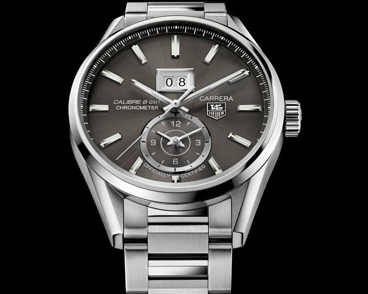 Новая модель Calibre 8 Grande Date GMT от швейцарской часовой компании TAG Heuer имеет круглый полированный корпус, диаметром 41 мм, водонепроницаемый до 100 метров. На торце завинчивающейся рифленой заводной головки, расположенной на 3 часах, выгравирован логотип бренда TAG Heuer. Сапфировое стекло установлено на передней стороне корпуса (с антибликовым покрытием) и на его завинчивающейся задней крышке. Циферблат серебристого, антрацитового или черного цвета, с накладными родированными часовыми индексами, покрытыми, как и часовая и минутная стрелки, люминесцентным составом белого цвета.