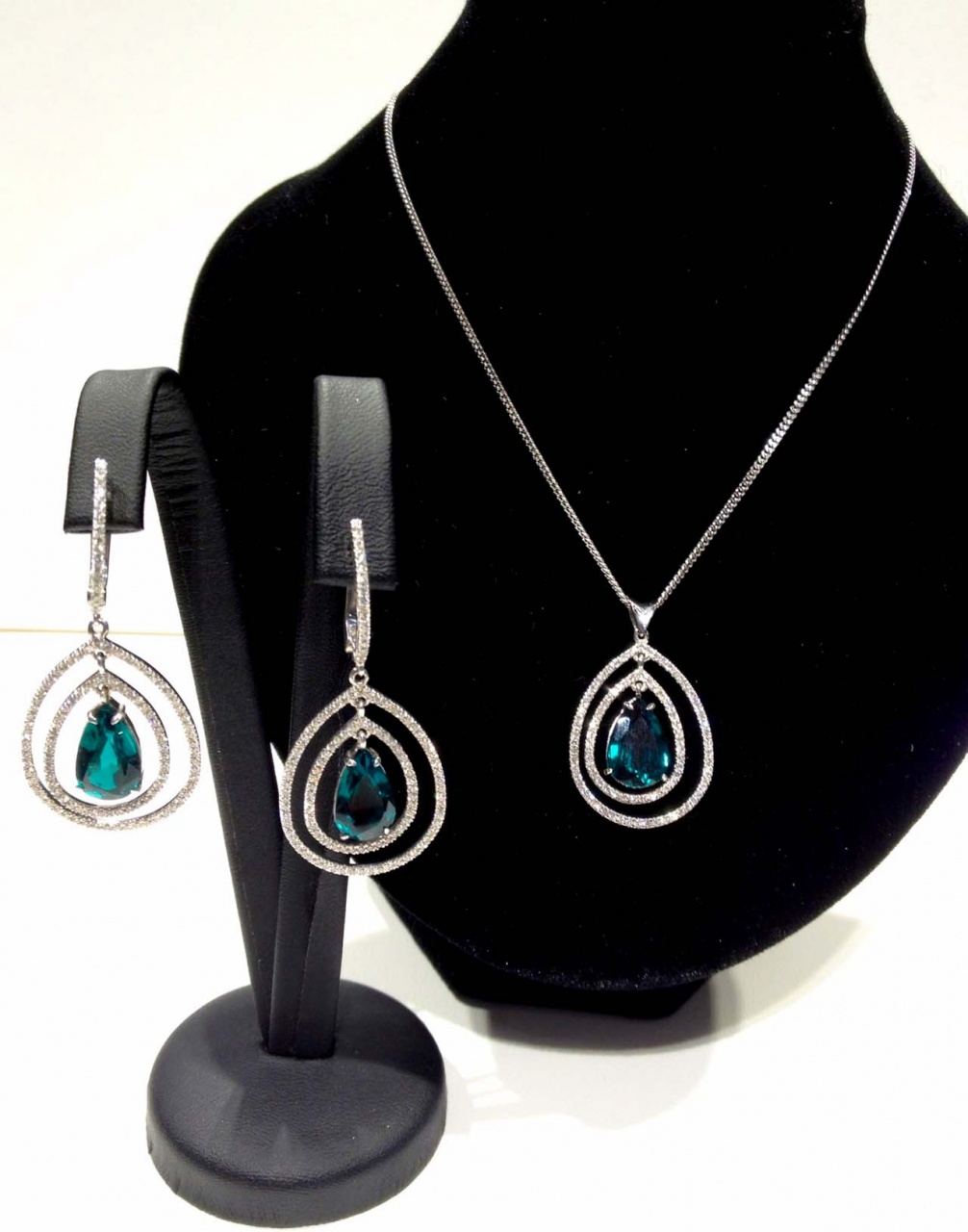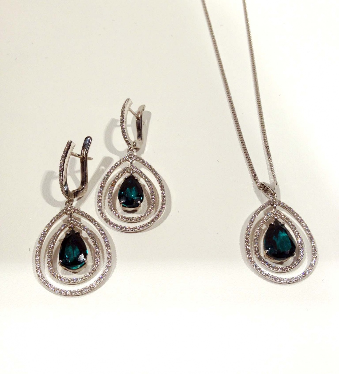 Продается эффектный комплект с изумрудами и бриллиантами в белом золоте.