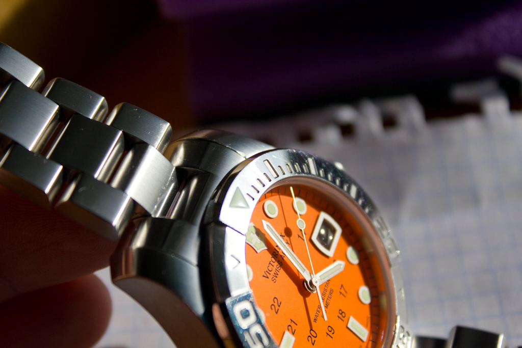 На корпусе и браслете незначительные следы носки, на безеле небольшие потертости, заметные лишь под определенными углами. Часы сделаны ОЧЕНЬ добротно, обработка корпуса и браслета на высоком уровне. Секундная стрелка точно попадает в деления. Браслет укорочен, снятые звенья в комплекте.