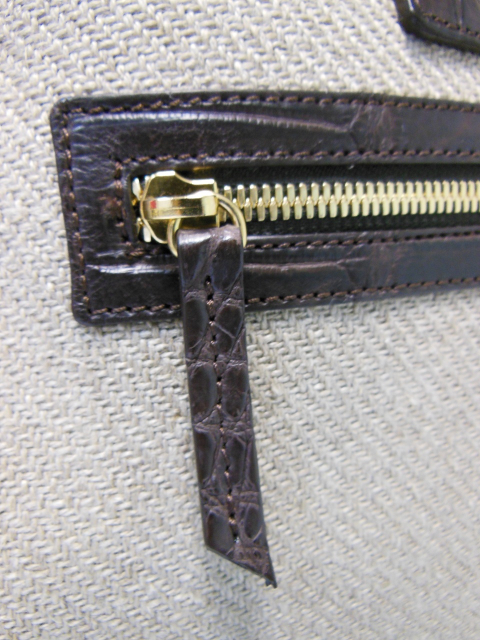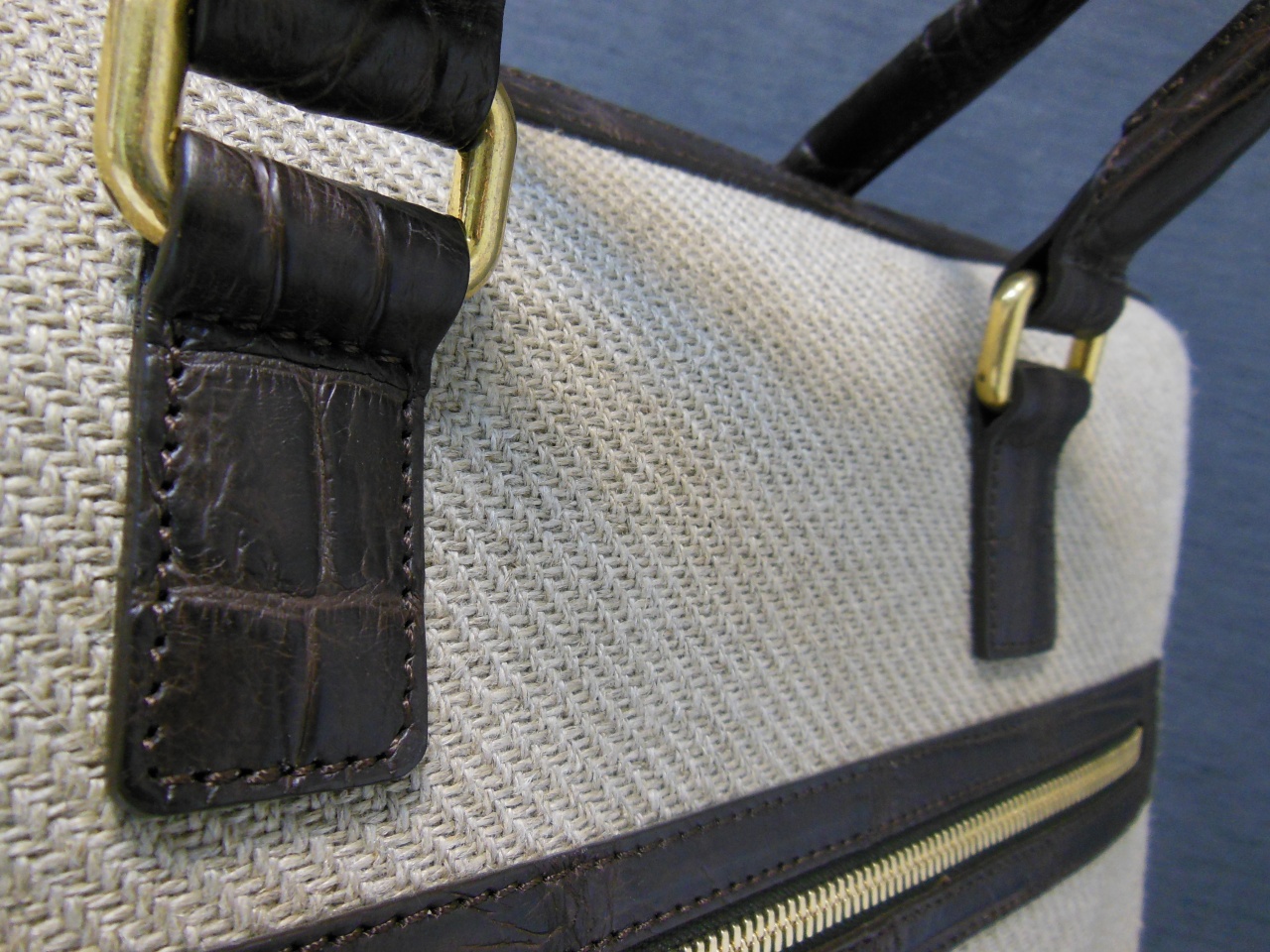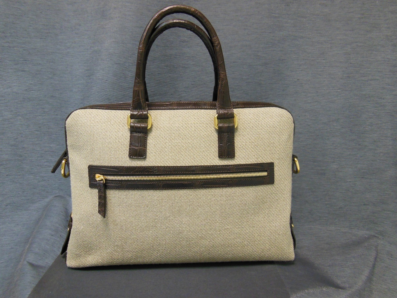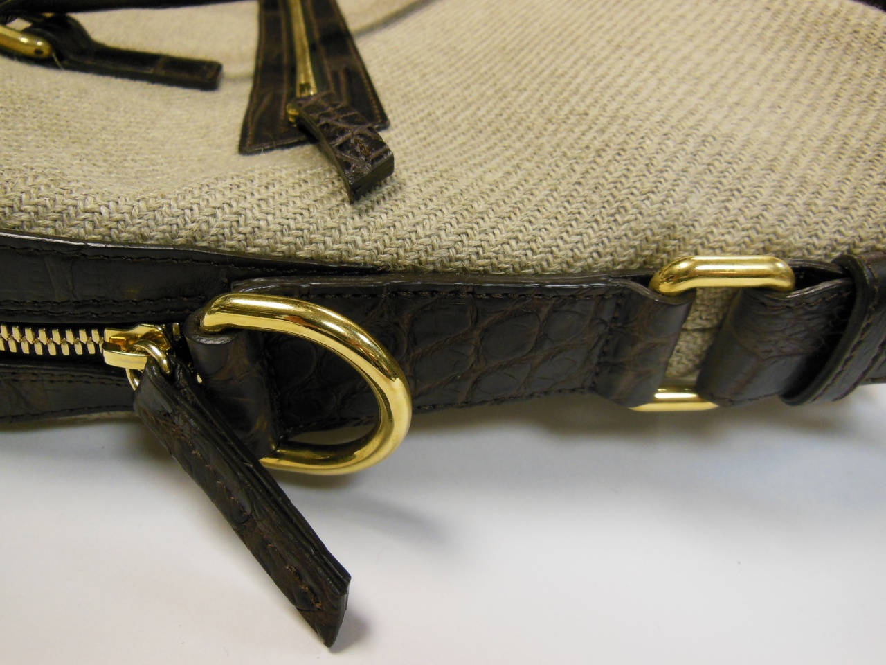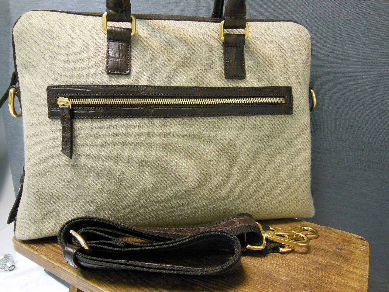 сумка ручной работы «Brianza» из 100% текстиля джутового плетения. Детали и декоративные элементы сумки изготовлены из кожи аллигатора тёмно-коричневого цвета, и латуни, покрытой позолотой 24 карата. Сумка застегивается на позолоченные молнии с бегунками из кожи аллигатора и имеет снаружи отделение для небольших документов . Внутренняя часть сумки изготовлена из хлопковой ткани коричневого цвета, и имеет одно большое отделение для переноски документов и прочих вещей, и дополнительное отделение на молнии. В комплекте к сумке прилагается регулируемый плечевой ремень из текстиля с отделкой из кожи аллигатора.