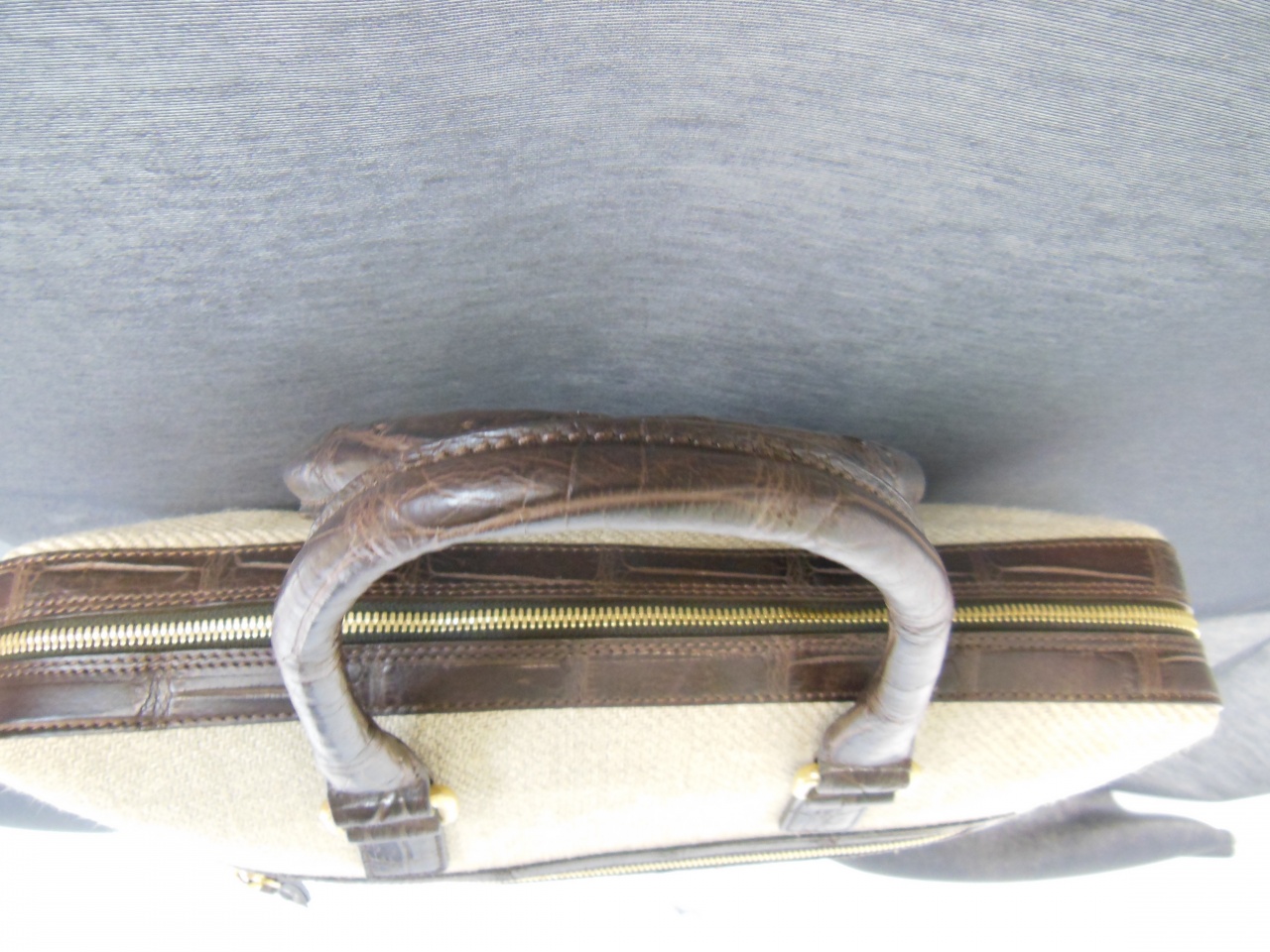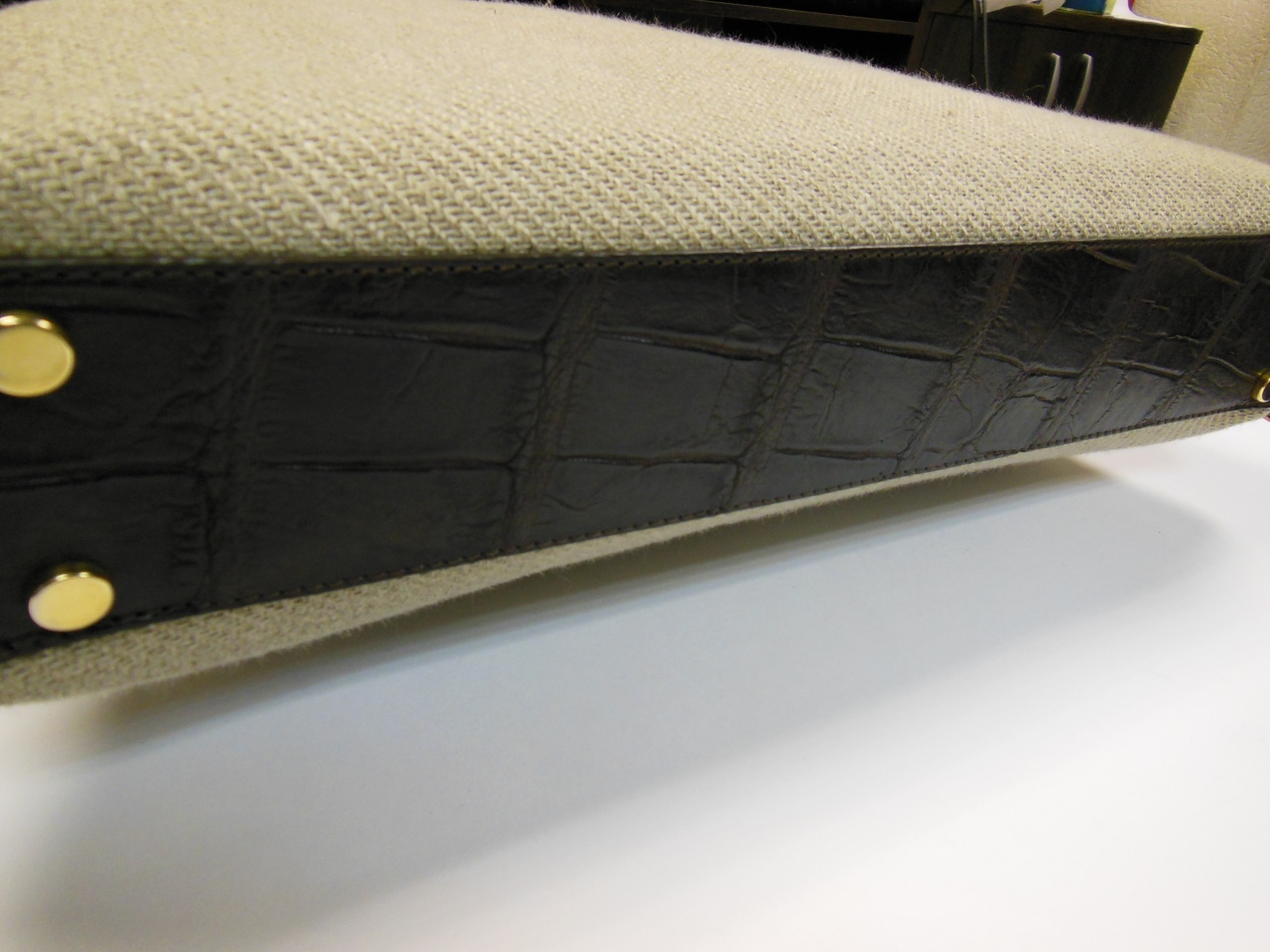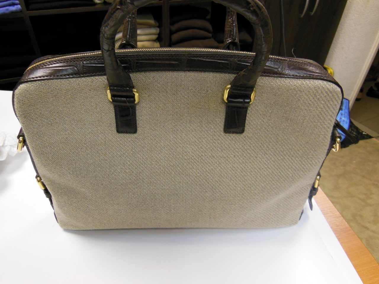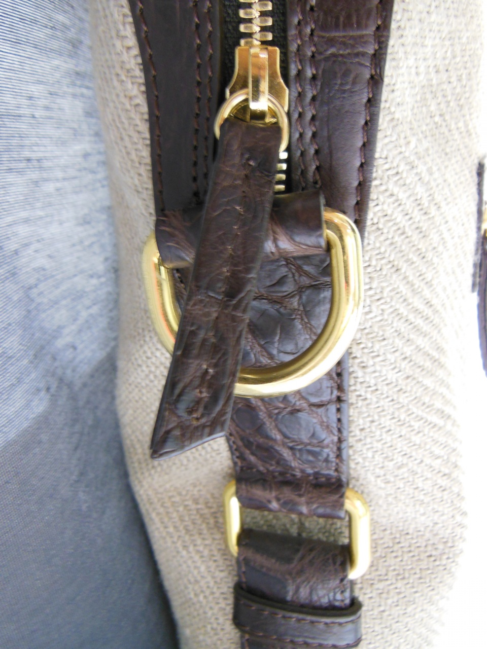 сумка ручной работы «Brianza» из 100% текстиля джутового плетения. Детали и декоративные элементы сумки изготовлены из кожи аллигатора тёмно-коричневого цвета, и латуни, покрытой позолотой 24 карата. Сумка застегивается на позолоченные молнии с бегунками из кожи аллигатора и имеет снаружи отделение для небольших документов . Внутренняя часть сумки изготовлена из хлопковой ткани коричневого цвета, и имеет одно большое отделение для переноски документов и прочих вещей, и дополнительное отделение на молнии. В комплекте к сумке прилагается регулируемый плечевой ремень из текстиля с отделкой из кожи аллигатора.