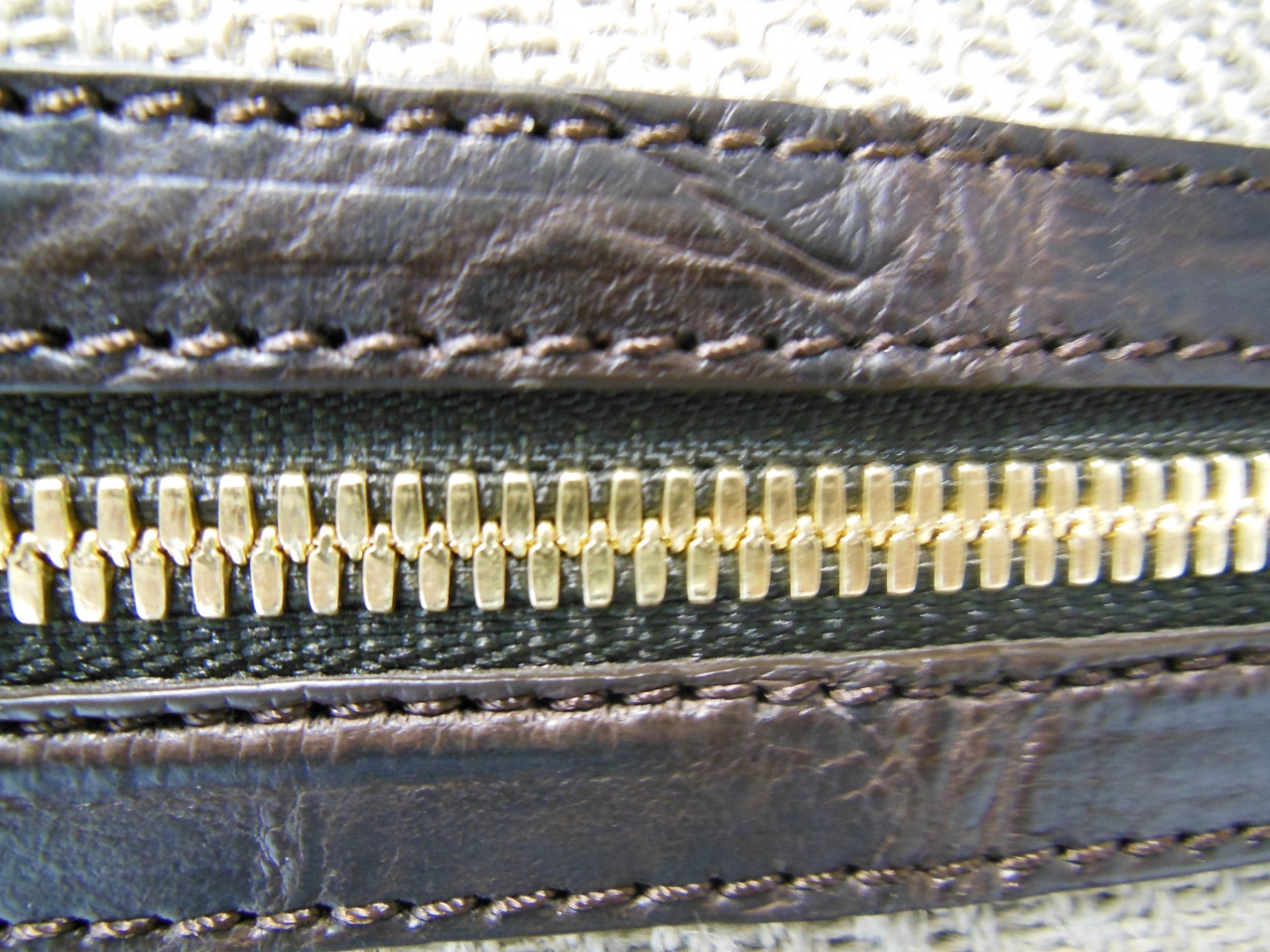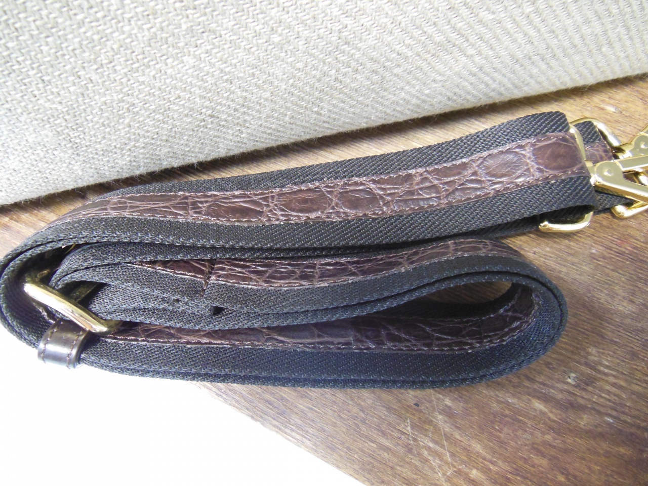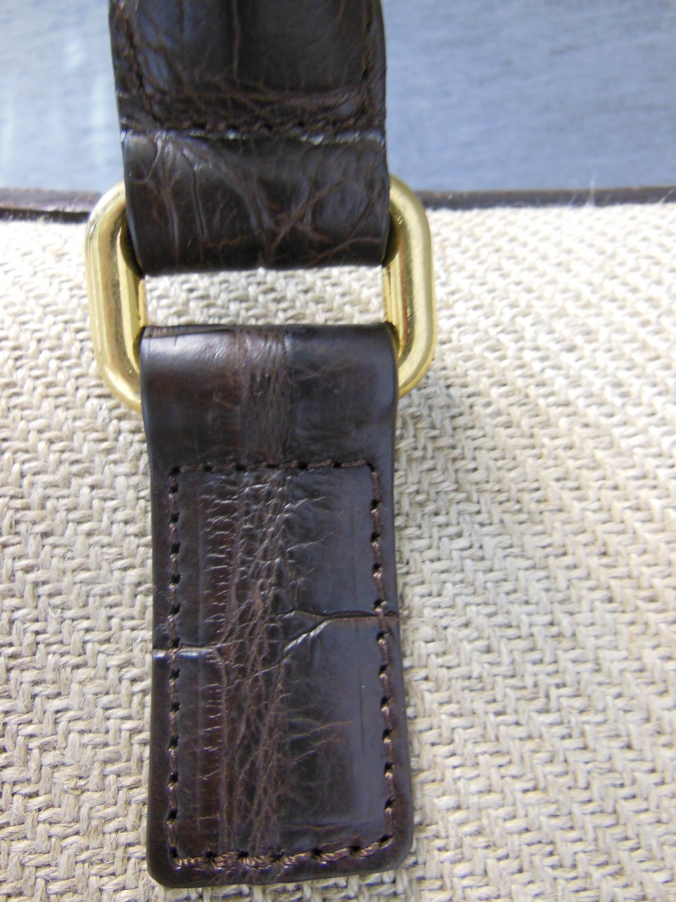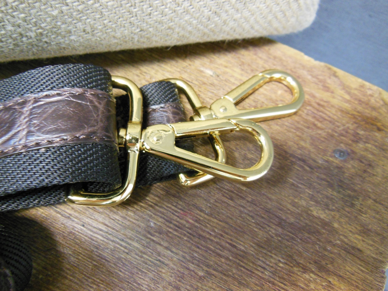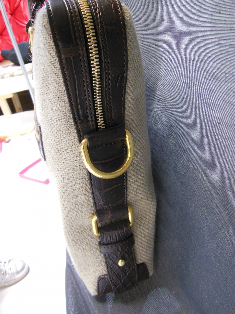 сумка ручной работы «Brianza» из 100% текстиля джутового плетения. Детали и декоративные элементы сумки изготовлены из кожи аллигатора тёмно-коричневого цвета, и латуни, покрытой позолотой 24 карата. Сумка застегивается на позолоченные молнии с бегунками из кожи аллигатора и имеет снаружи отделение для небольших документов . Внутренняя часть сумки изготовлена из хлопковой ткани коричневого цвета, и имеет одно большое отделение для переноски документов и прочих вещей, и дополнительное отделение на молнии. В комплекте к сумке прилагается регулируемый плечевой ремень из текстиля с отделкой из кожи аллигатора.