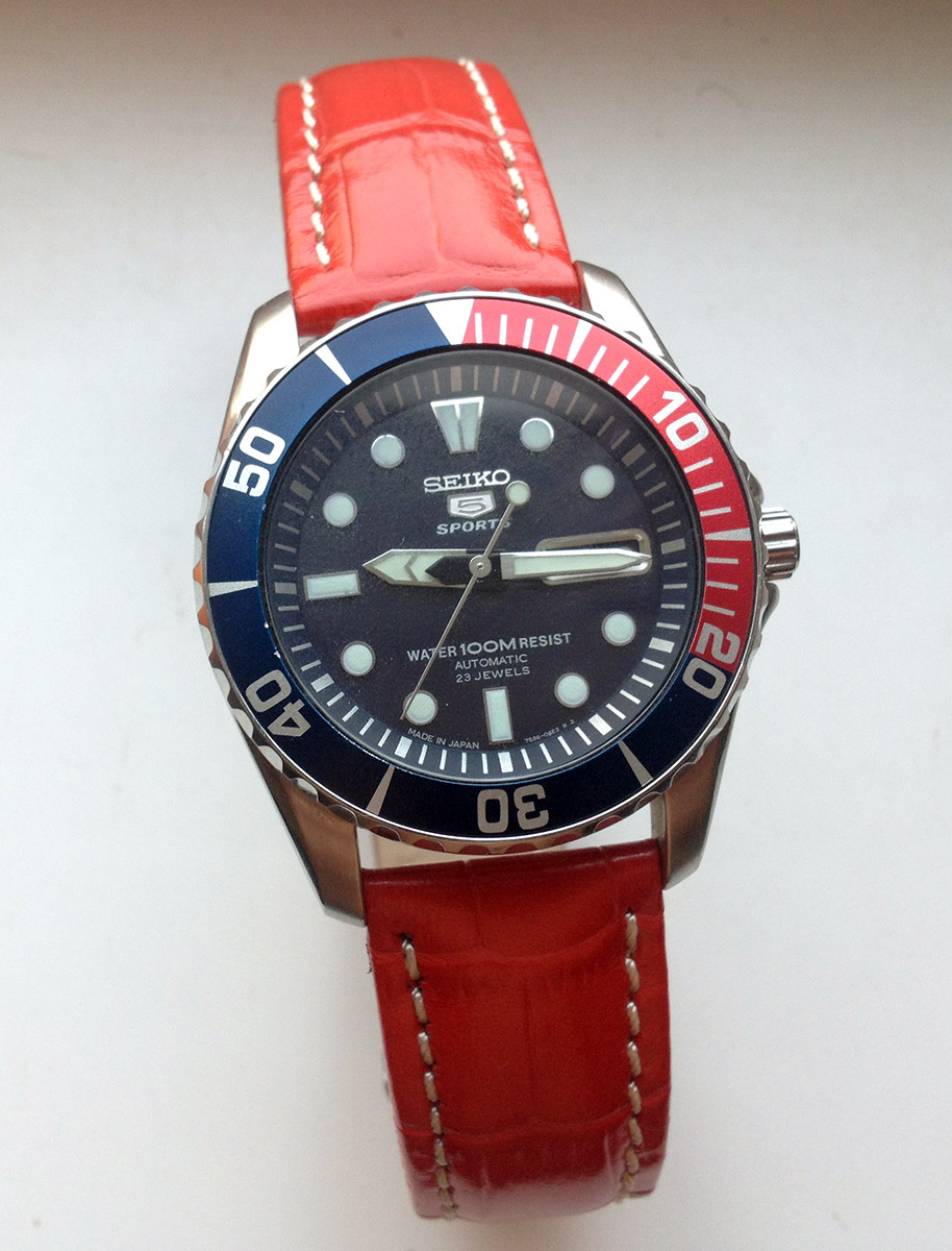 к моему SEIKO 5 Submariner SNZF15 SNZF15J2 Japan Made я уже прикупил красный ремешок и синий ремешок (в цвет безеля)