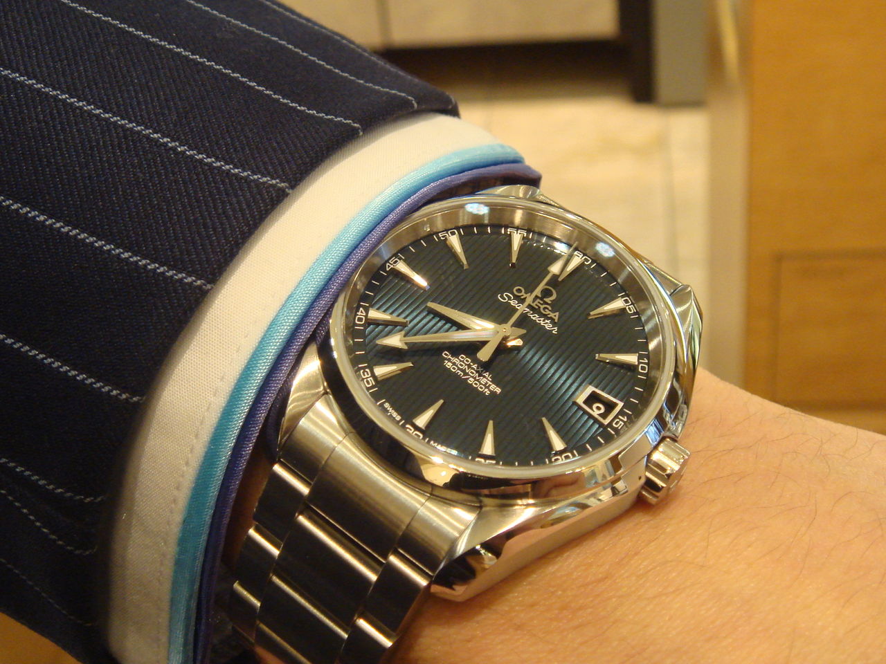 ). Но начал присматриваться к ним со всех сторон и начали нравиться внутренне) Мануфактура, взрослее (по работе выгодно), на все случаи жизни, не кричащие, заинтересовывающие при близком рассмотрении, запас хода выгодный, механизм виден сзади (видимо для первых моих часов это имеет какое то значение). Вообщем присмотрелся, но цвет все равно серый как то... Наткнулся на синюю и понравилось. В гуме убедился что цвет то что надо и размер 41 появится скоро) Даже заказал у димы для себя синюю(хотя он почему то не звонит). Но так как покупка будет только в августе, то решил еще поискать варианты. Вариантов нет. Кроме ролекса) Експлорер1 без даты мне не интересен все же, либо саб либо ддж2.. убедился что новые за 200 000, а б/у для первых часов и особенно для ролекса не рекомендуют+душа не лежит. И опять решил что только Омега. А из нее только Акватера синяя 41. Но кто-то изнутри спрашивает а может не синюю, а гольф или серую - ведь они как то стандартнее чтоли и под костюм хорошо будут.. а в будущем все равно куплю саб, возможно черный и зачем тебе нужна будет эта синяя омега?) такой диалог внутри от куда то взялся))) видимо синих никогда не носил, хотя при примерке и не сказал бы что они синии то, больше на черные похожи, но все же.. Столько всего написал, благодарен тем кто дочитал хотя бы до середины и читает конец)) но.. Хочется все же обсудить акватеру выбранную с кем то, скорее с вами))) В поиске все изучил, перечитал все что по симастеру в первых 30 страницах по разделу омеги, страницу за страницей, но организм требует еще по синей пообщаться) прикрепил несколько чужих фото занимающих первые места в моем рейтинге среди удачных фото этой модели) и вообще по модели этой есть вопросы: