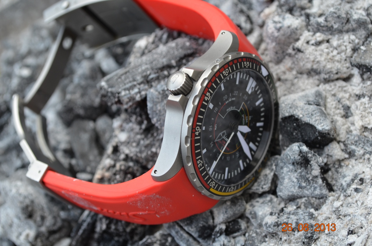 В отпуске почувствовал нехватку индикации второго часового пояса, хотя конечно привыкаешь через несколько дней прибавлять/отнимать.. Хотелось безель дайверский, чтоб в повседневной жизни засекать время или ставить метку на определнное время. Хронограф не подходил, т.к. во-первых, это меньшая легкость считывания времени, а во-вторых лишние кнопки, они должны были бы закручиваться, а чтоб поплавать их нужно закрутить, и песком они вполне себе забивались бы... Короче, неудобств больше чем пользы. В качестве разнообразия хотелось иметь часы с темным покрытием типа DLC, но не глянцевым, или титановый матовый корпус, но титан легко царапется, так что это сомнительное достоинство. Хотелось ремень, который бы имел округлую форму по запястью (имею небольшое запястье и плоские ровные ремни дают часам "сваливаться" на бок на запястье) и имел либо обычную застежку-шип или возможность регулировки (как у Брайтлинга клипса для каукчука), т.к. иногда ношу часы для удобства сверху на рукав. Что еще.. - хотелось каких-нибудь интересных особенностей, которые бы выделяли их из общей массы дайверов и псевдодайверов и цветной ремень или циферблат. Корпус должен был быть 40-42мм и толщину не очень большую. Но здесь был вопрос больше не в диаметре корпуса, а в размере по краям от ушек до ушек.
