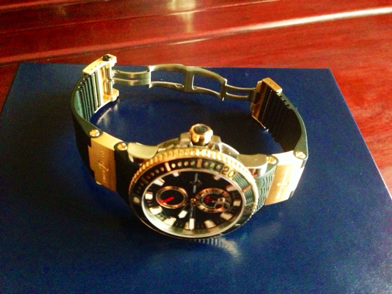 Подарок. Одевались 3 раза. Состояние новых. Все коробки док-ты итд итп полный набор естественно имеется. Размер 45. Корпус золто, титан. Ремень немного подрезан но новый стоит копейки в районе 10тр.