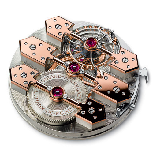 часовой механизм с тремя параллельными мостами, в форме стрелок. Эта модель оставила глубокий след в истории часового искусства, не только благодаря своей красоте, но и благодаря объединению эстетического и функционального подходов к конструированию часового механизма. Механизм новой модели Girard-Perregaux Tourbillon with Three Gold Bridges Pocket, с ручным заводом, на 30 камнях, включает в себя, в общей сложности, 249 деталей, диаметром 45, мм, толщиной 10,0 мм, с балансовой частотой 21600 полуколебаний в час (3 гц), 32-часовым запасом хода, функциями индикации часов, минут (посредством соответствующих центральных стрелок), секунд (на малом боковом циферблате, расположенном на 6 часах), а также с минутным турбийоном (каретка последнего, выполненная в форме лиры, которая с 1880-х годов была признана во всем мире в качестве символа компании Girard-Perregaux, состоит из 92 деталей). Калибр великолепно вручную отделан и декорирован; в частности, полированием, гравированием, циркулярным зернением, воронением. Механизм официально сертифицирован COSC (Contrôle Officiel Suisse des Chronomètres) в качестве хронометра. Среднее отклонение суточного хода калибра составляет 0,1 сек/сут.